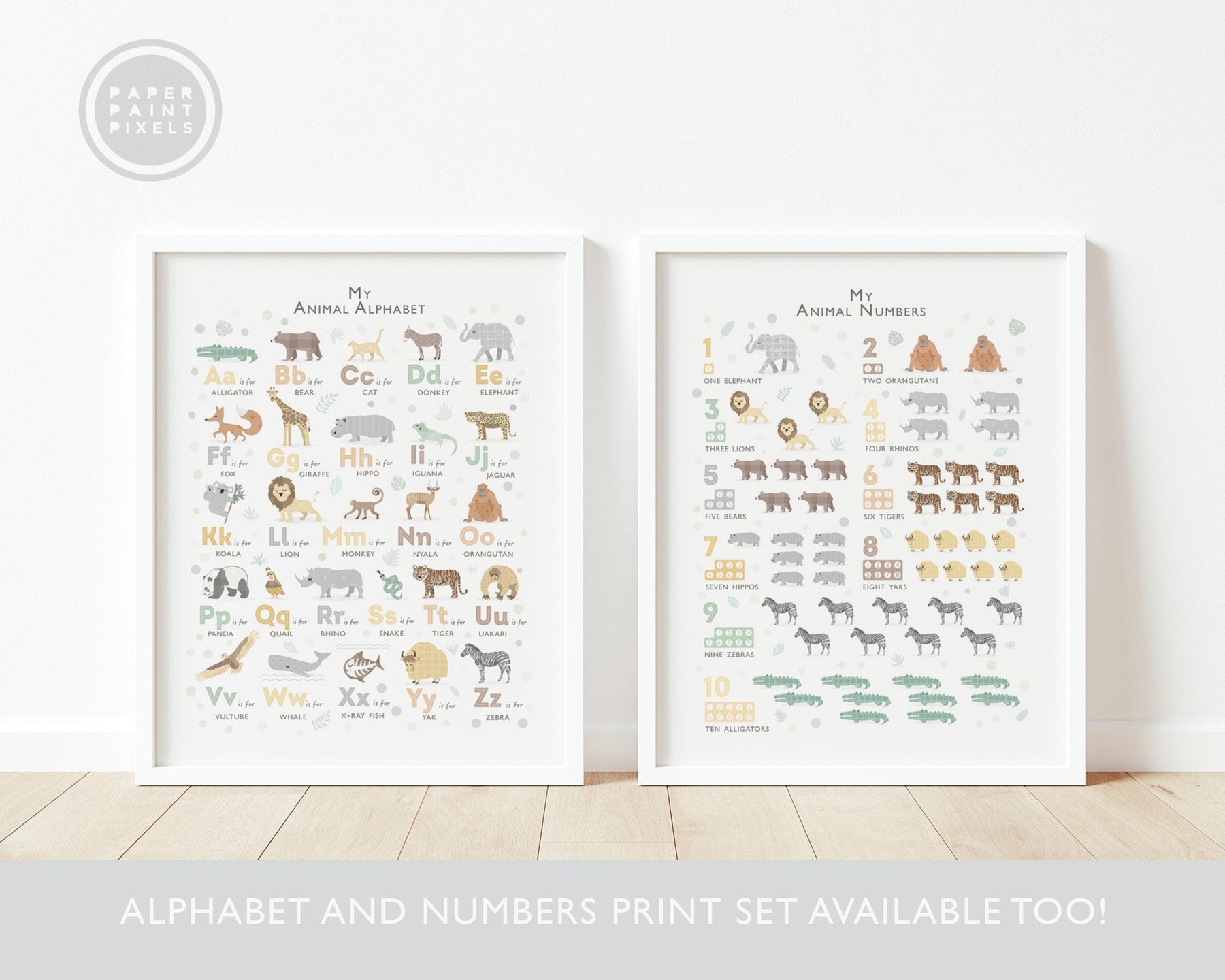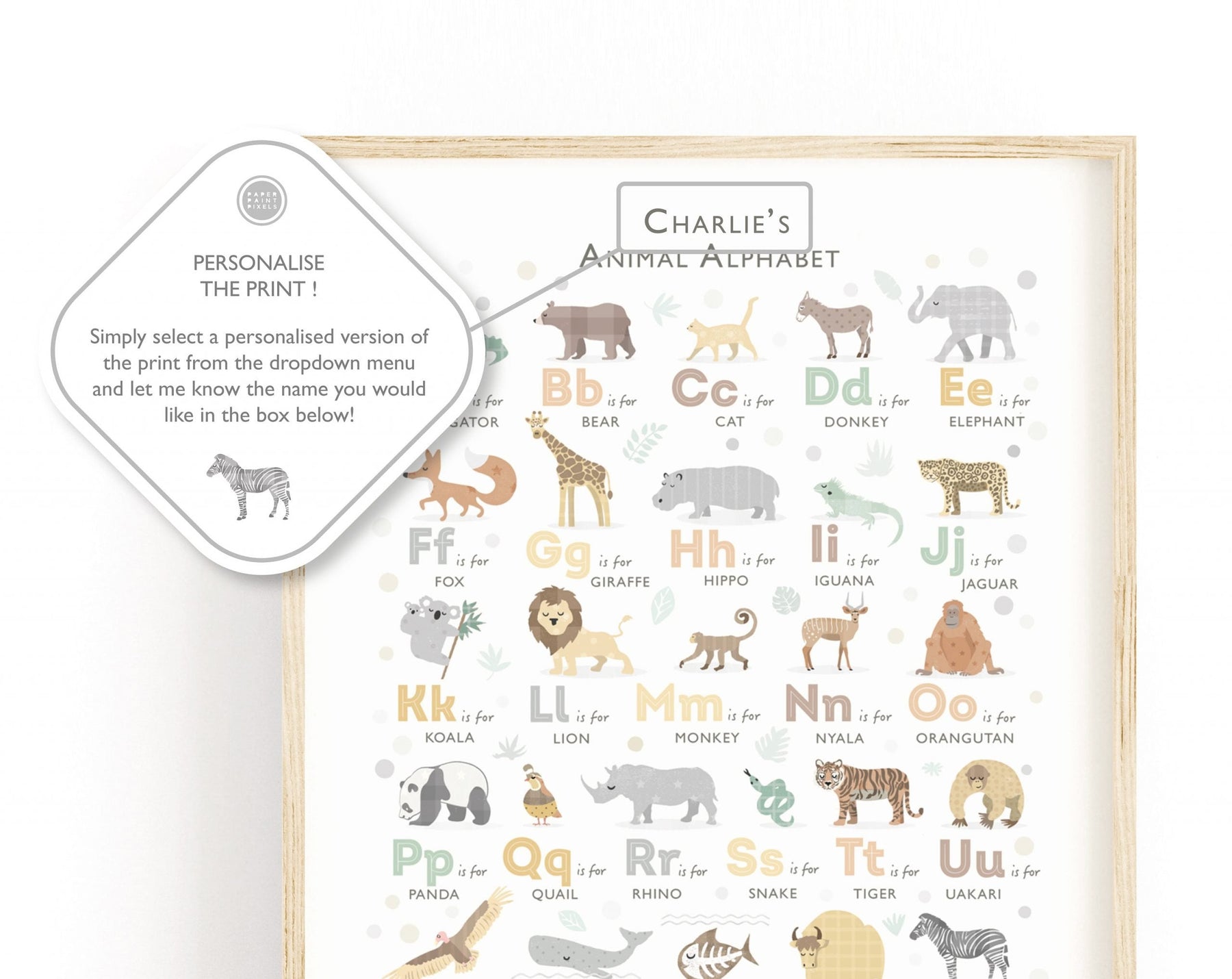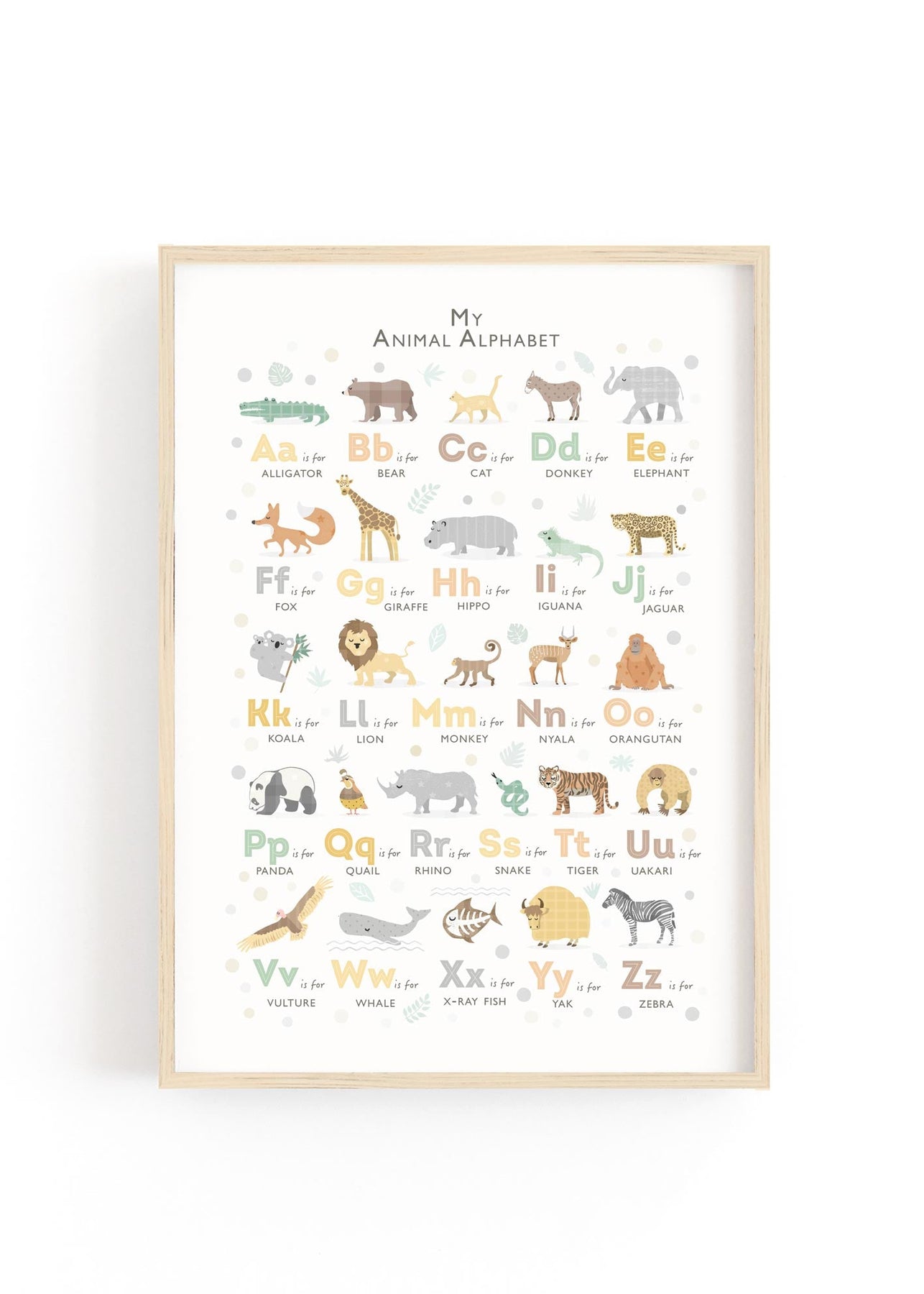 Each letter is paired with a hand-drawn safari animal, illustrated with soft details and a warm, earthy palette. This print is a beautiful focal point for a neutral or safari-themed nursery, creating a sophisticated and calming space for your little explorer to grow