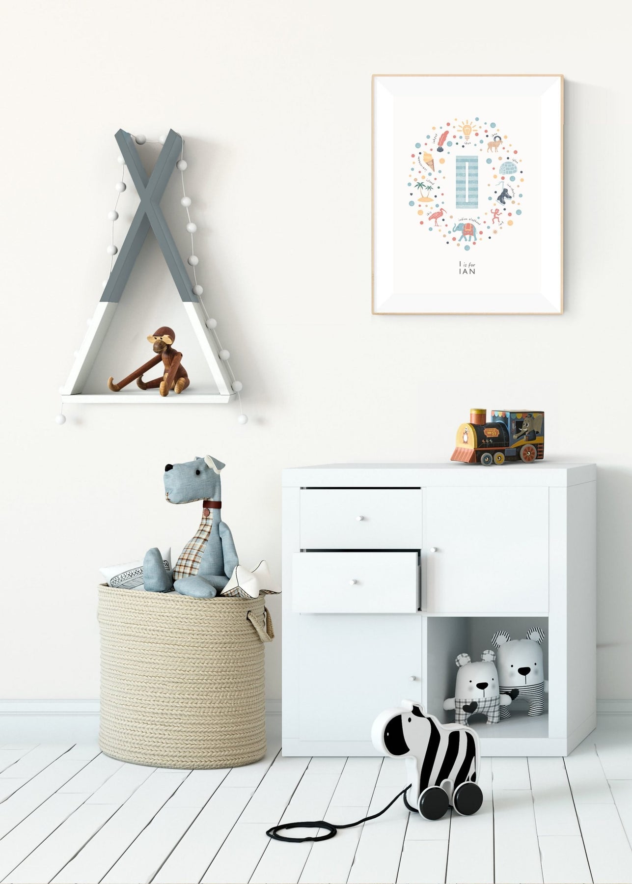 A gorgeous personalised nursery print beautifully illustrated with cute things beginning with the Letter I. I is for Ice Skates, Island, Idea, Ibis, Ibex, Indian Elephant, Inkpot, Ice Cream, Igloo and you choose the name underneath.