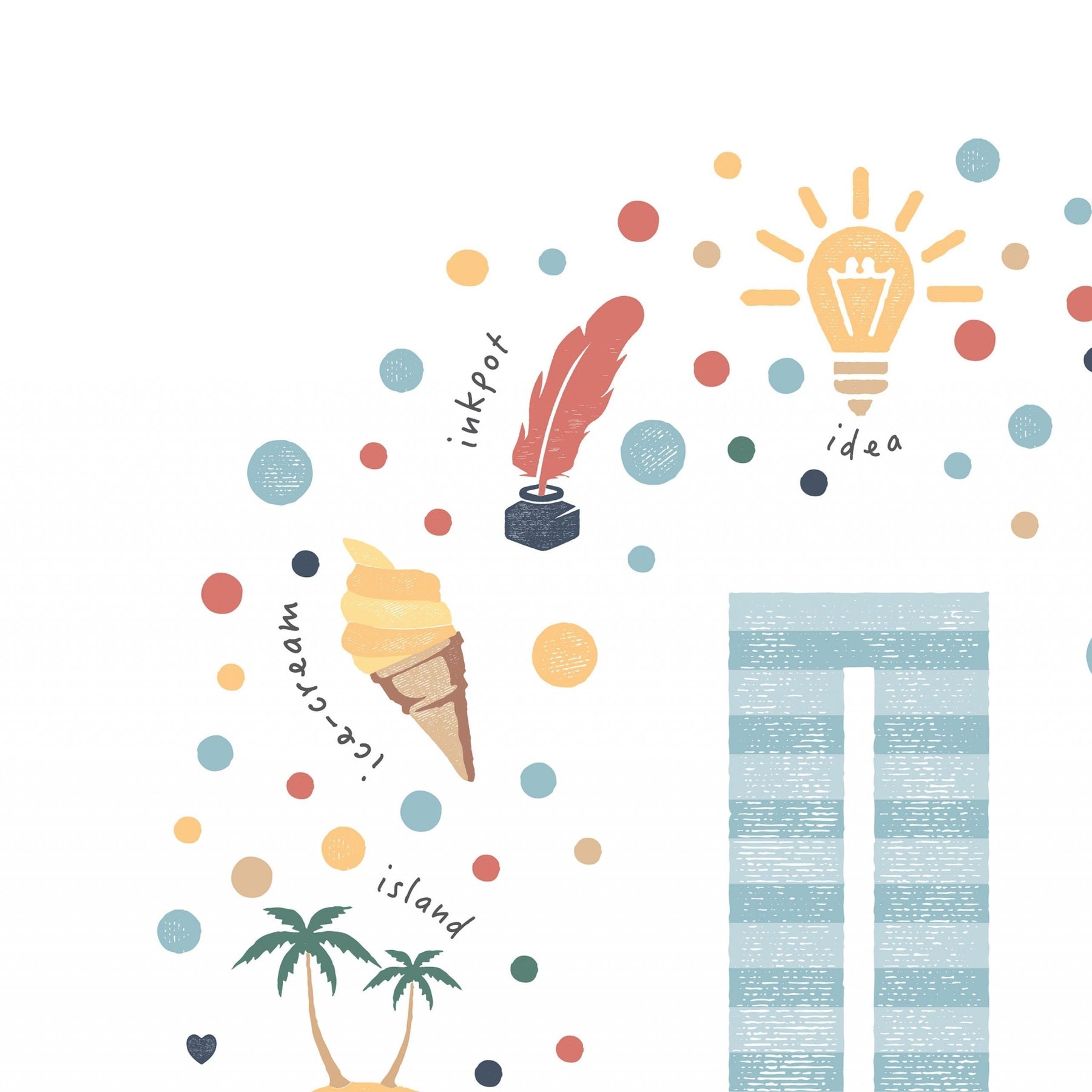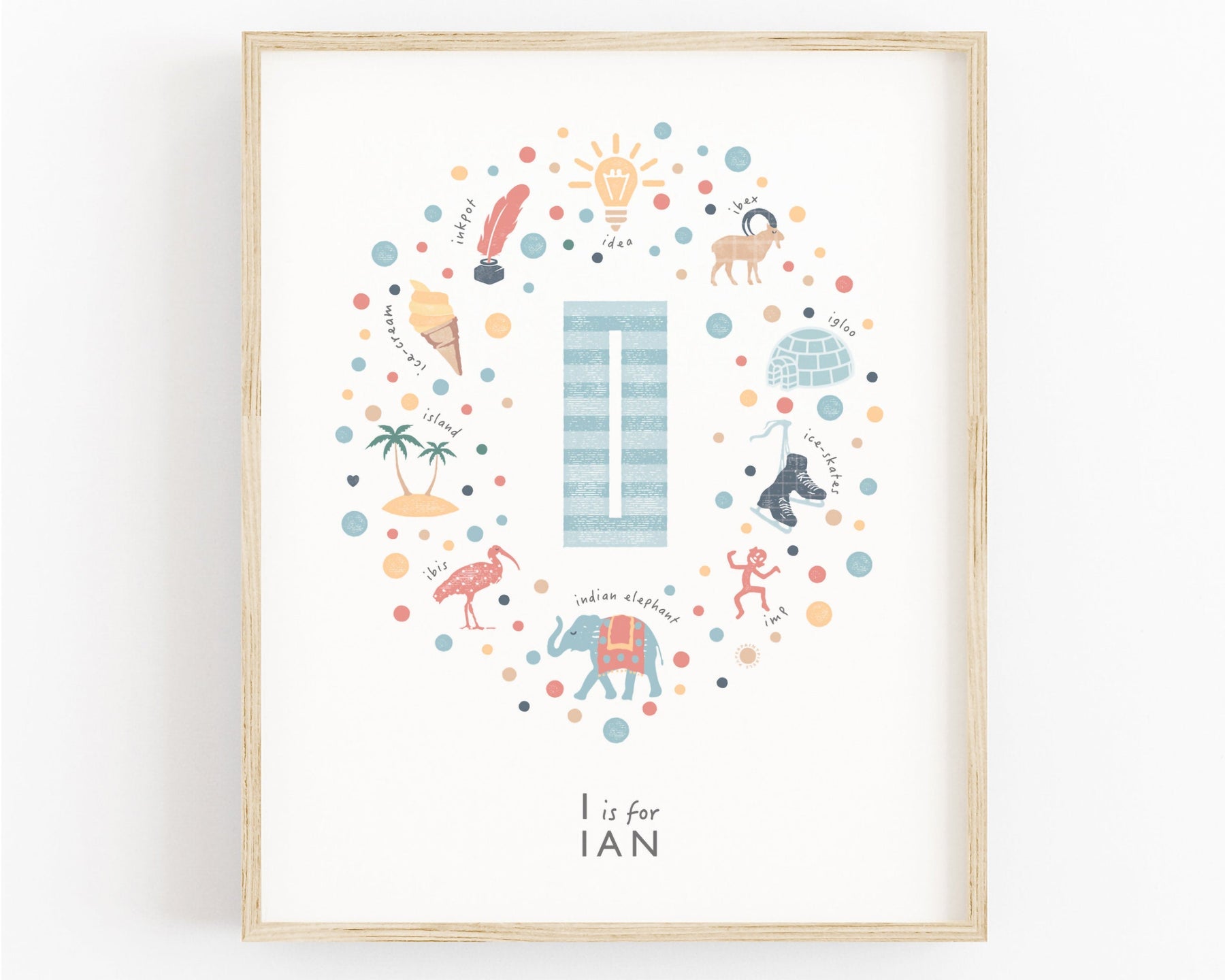 A gorgeous personalised nursery print beautifully illustrated with cute things beginning with the Letter I. I is for Ice Skates, Island, Idea, Ibis, Ibex, Indian Elephant, Inkpot, Ice Cream and Igloo