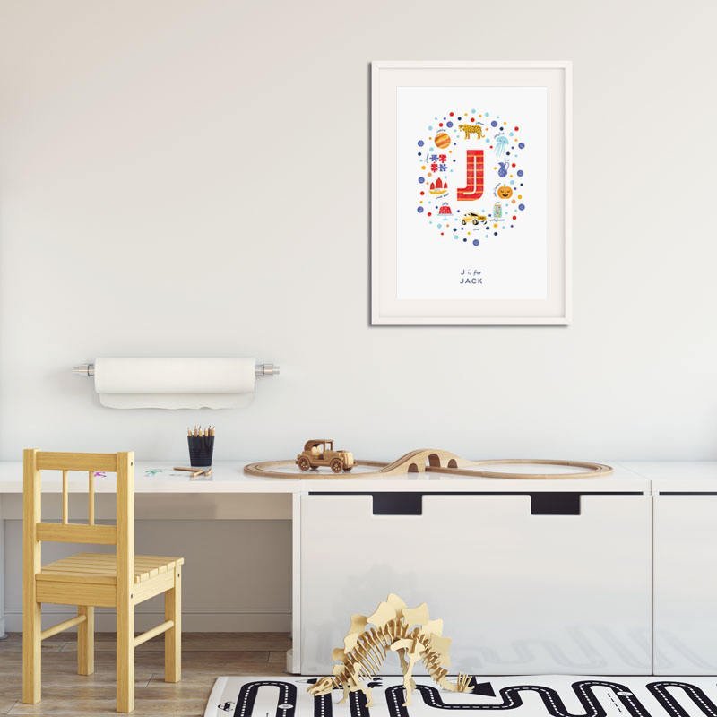 A beautifully illustrated Personalised Letter J Art print. J is for Jaguar, Jellyfish, Jug, Jack O' Lantern, Jar, Jelly Beans, Jeep, Jelly, Junk boat, Jigsaw and Jupiter and You choose the Name underneath. This print would be a great addition to any modern nursery or a totally cute new baby gift.