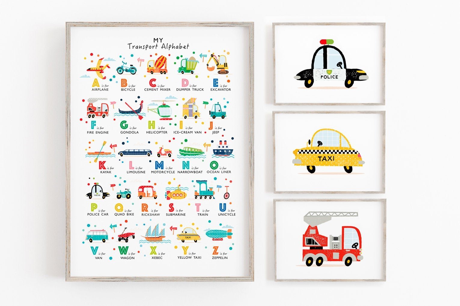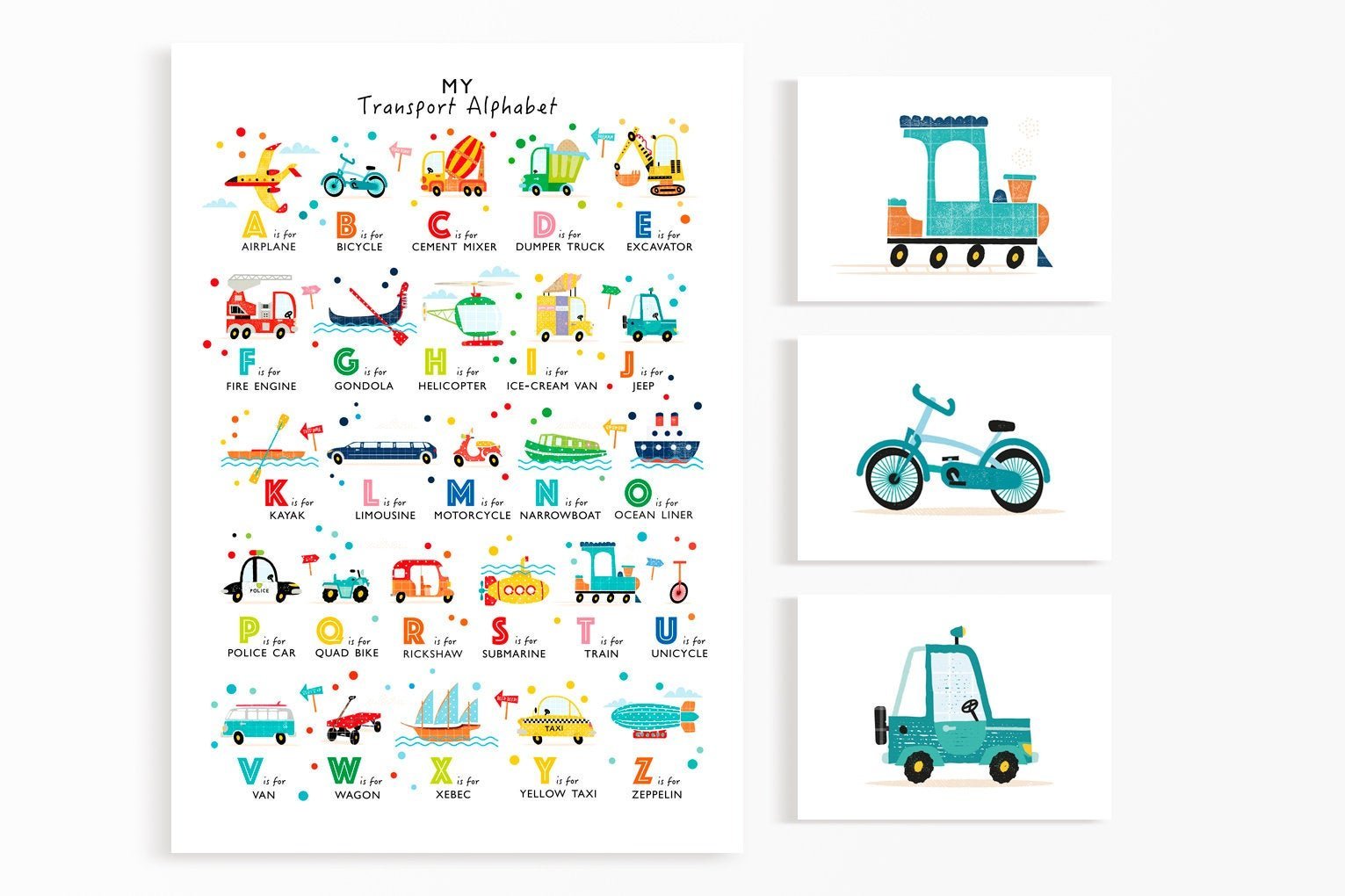 A vibrant, colourful transport wall art set featuring an alphabet and mix 'n' match prints which will bring the transport alphabet to life on your wall.
