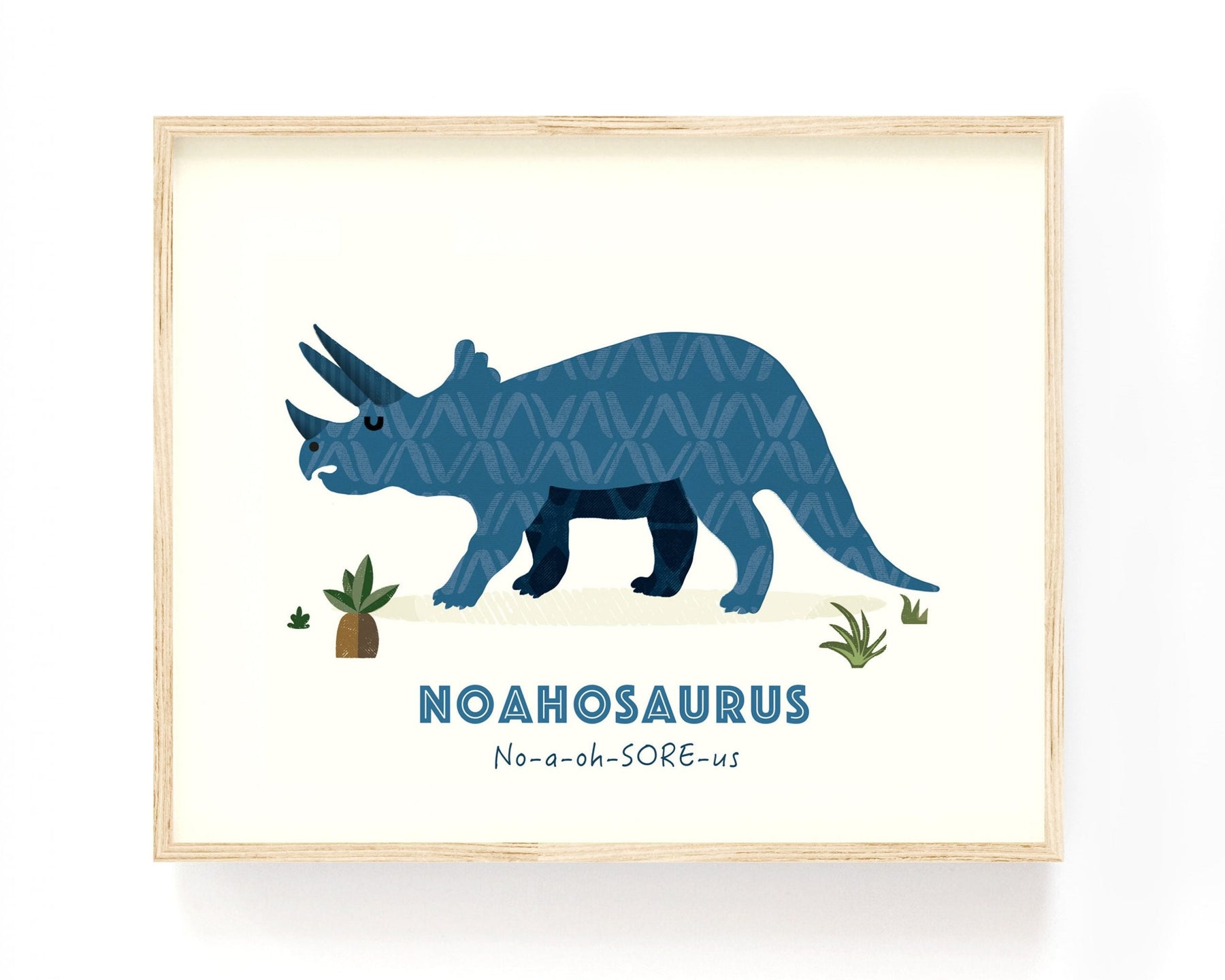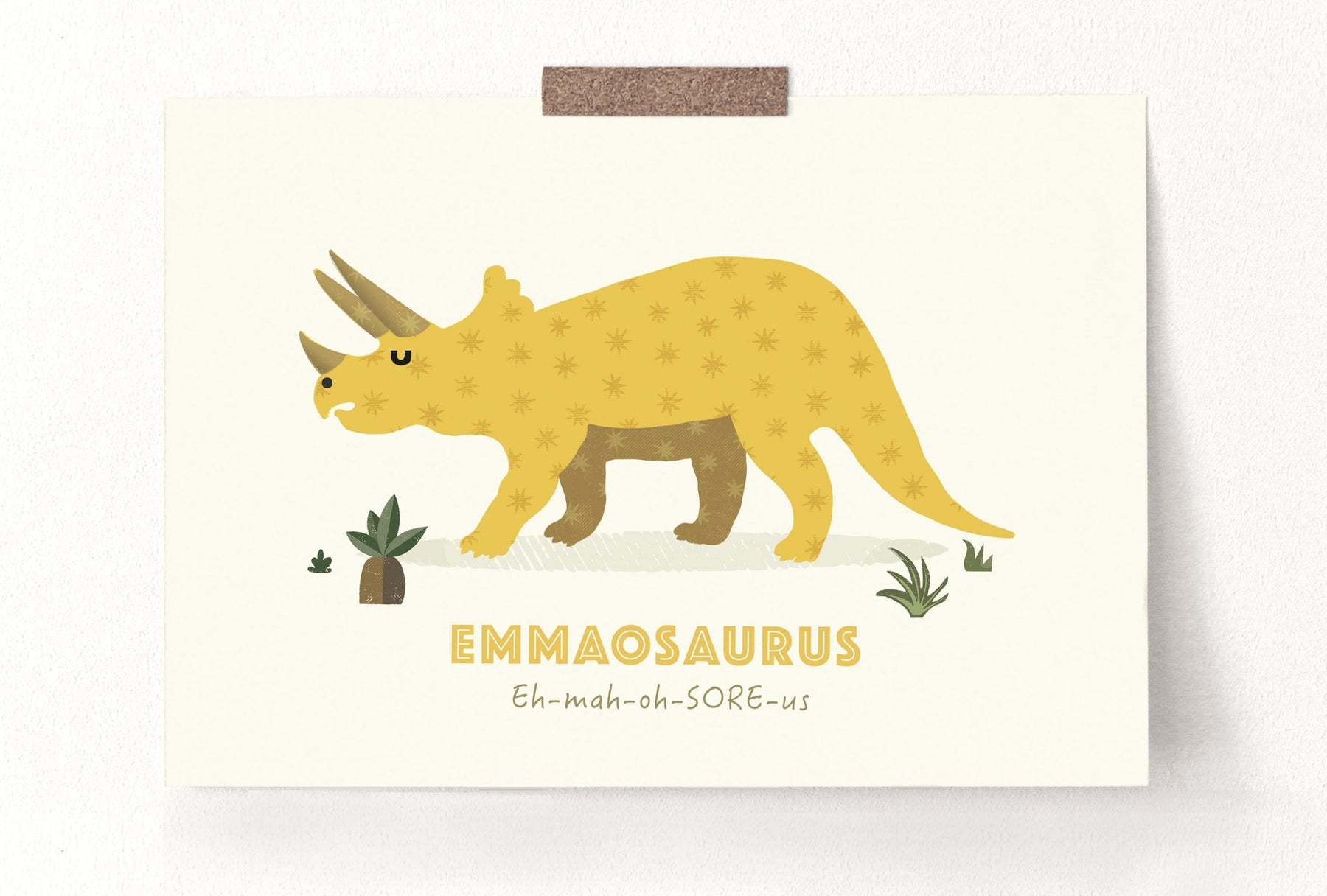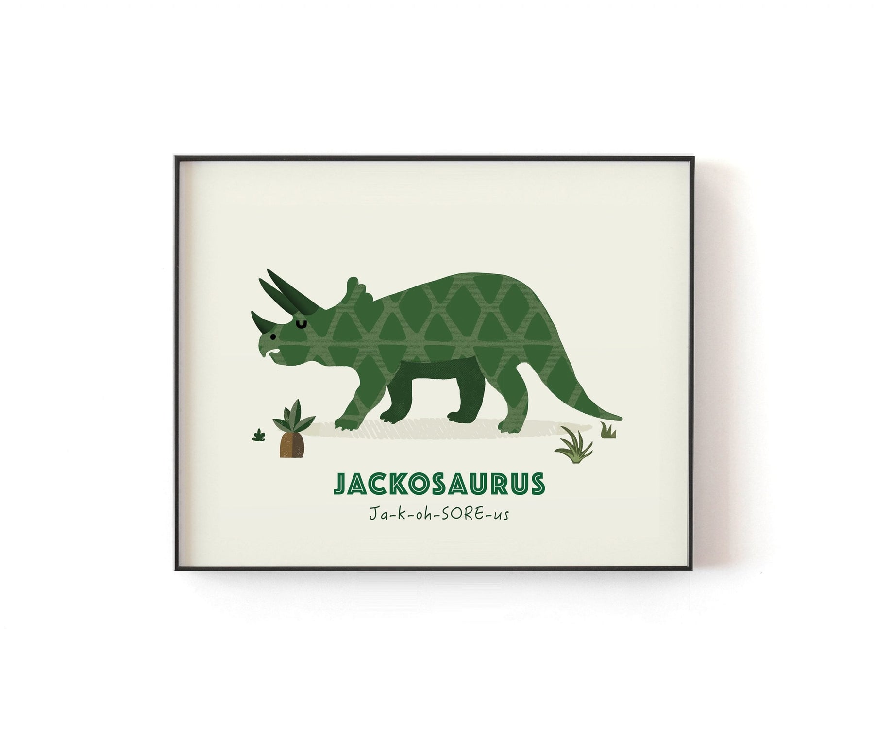 Designed with your little one in mind this super quality Triceratops Nursery Print contains a friendly T-Rex illustration and their very own Dino Name underneath, along with the phonetic pronunciation too!