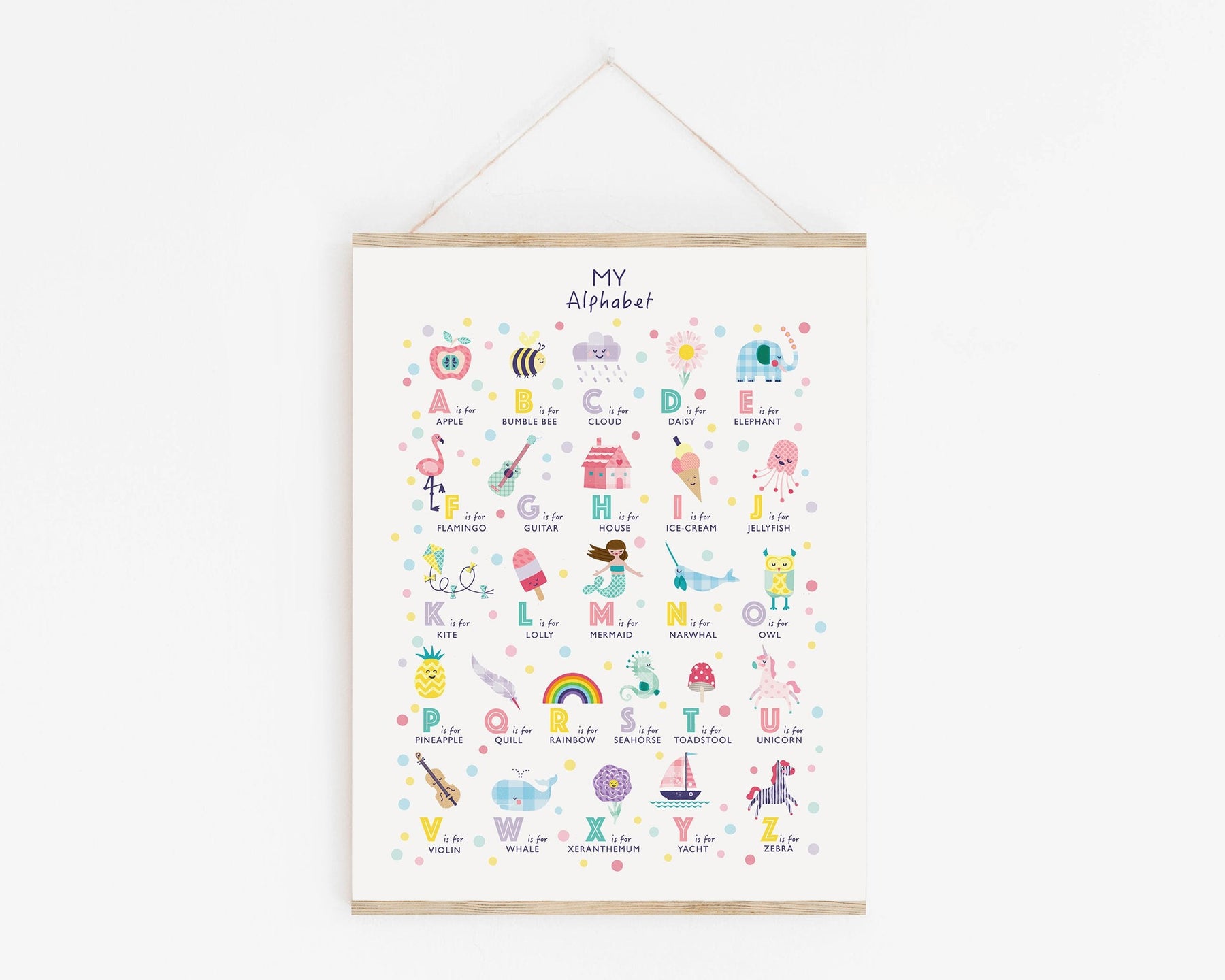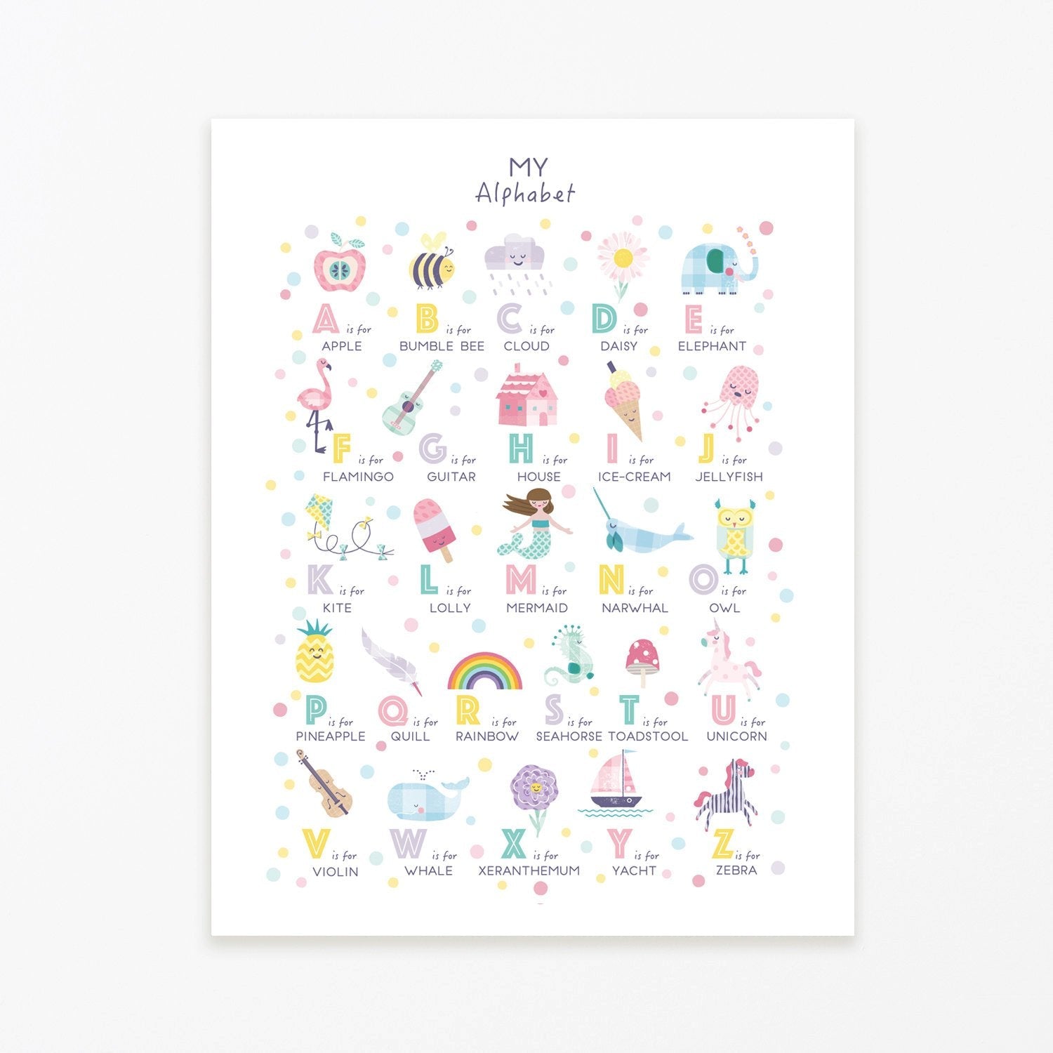 Our original lovely, pastel illustrated Girls 'My Alphabet' ABC Print. This super cute wall art will look pretty hanging in your nursery as well as being a lovely way to talk through the ABC's with your baby!