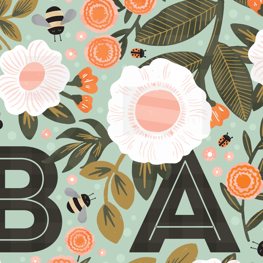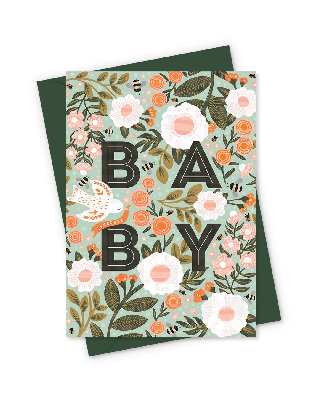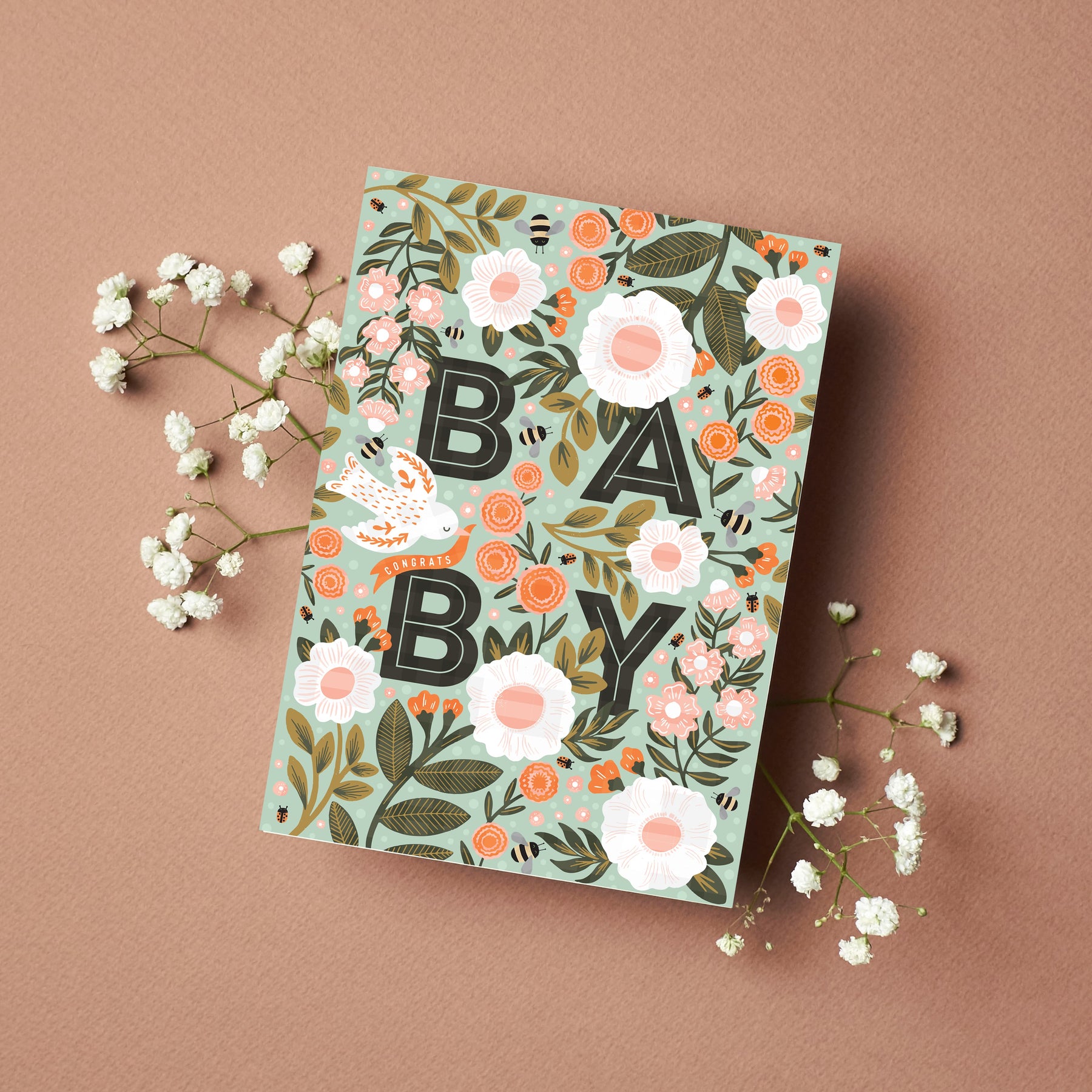 This card is a joyful meadow of flowers, designed to celebrate a beautiful new beginning. I scattered my hand-drawn illustrations of colourful, happy florals all over the page to create a feeling of pure abundance and cheer. Right in the centre, the simple, sweet word 'Baby' announces the wonderful news.