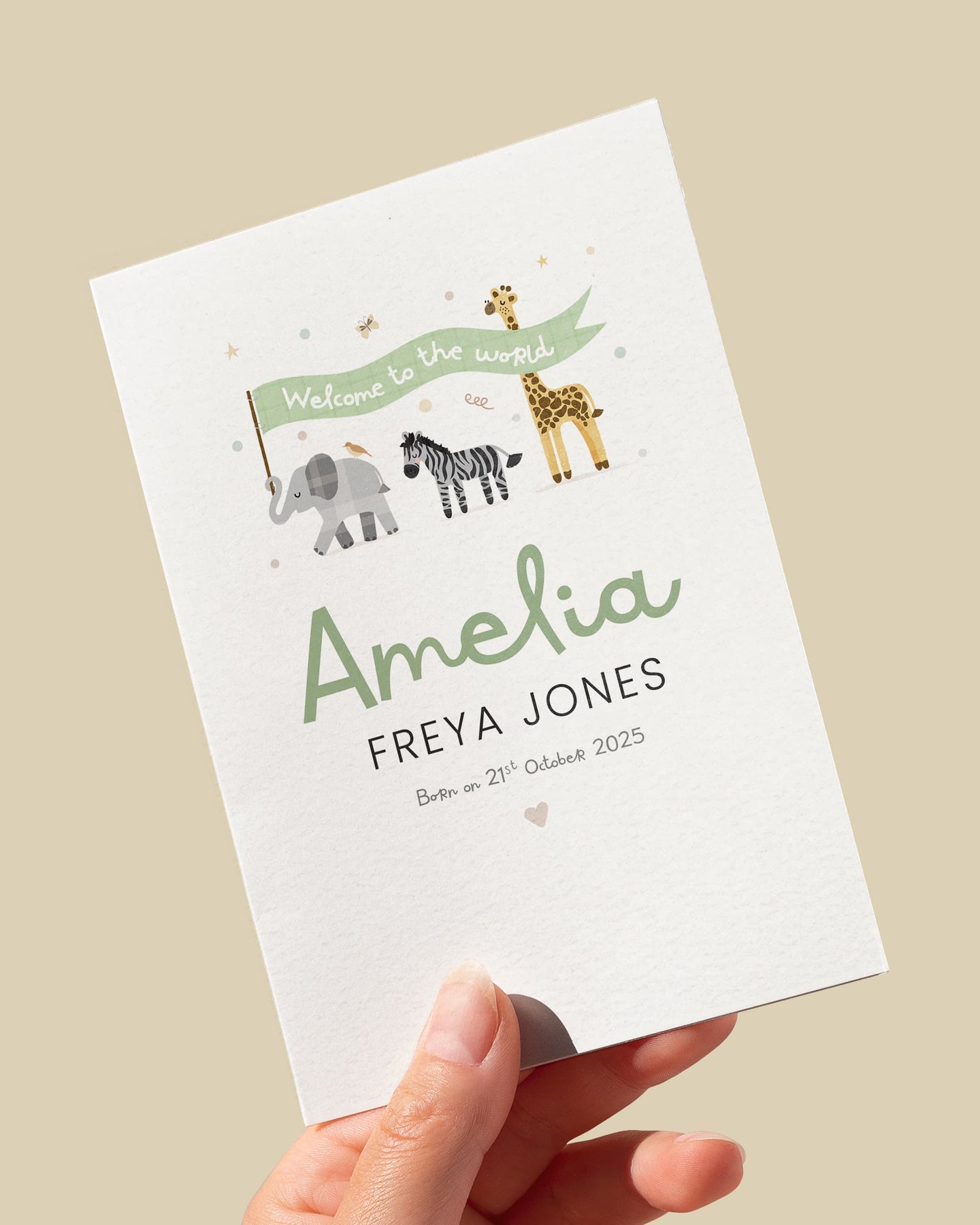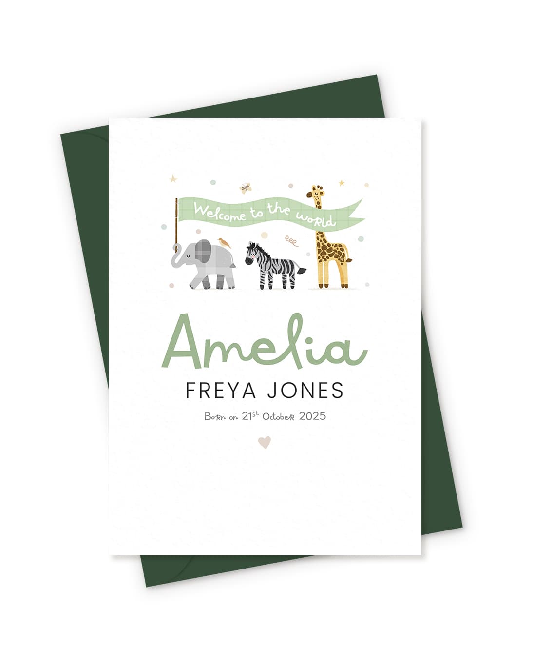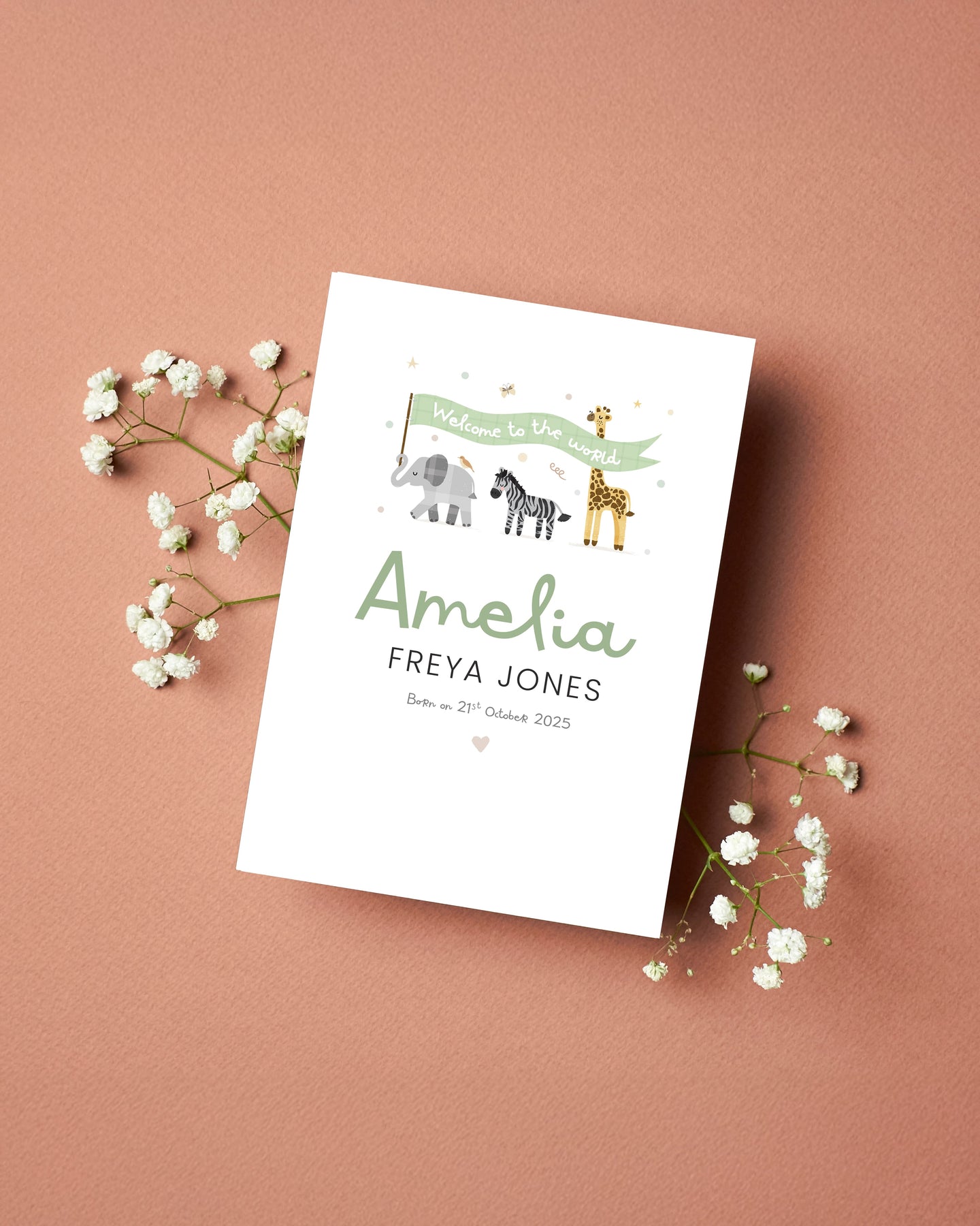 There's nothing more special than a card made just for them. I designed this print with a clean, gentle feel, so the focus is all on celebrating their new name, with a little help from a friendly giraffe and zebra. It's a simple, modern way to create a treasured, personal keepsake.