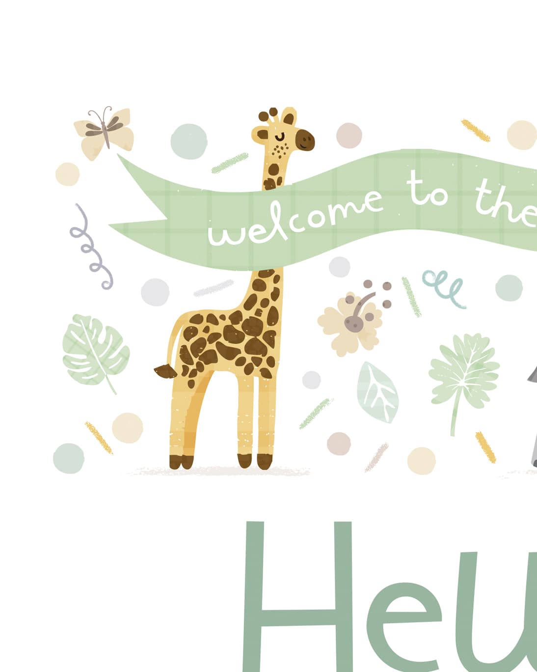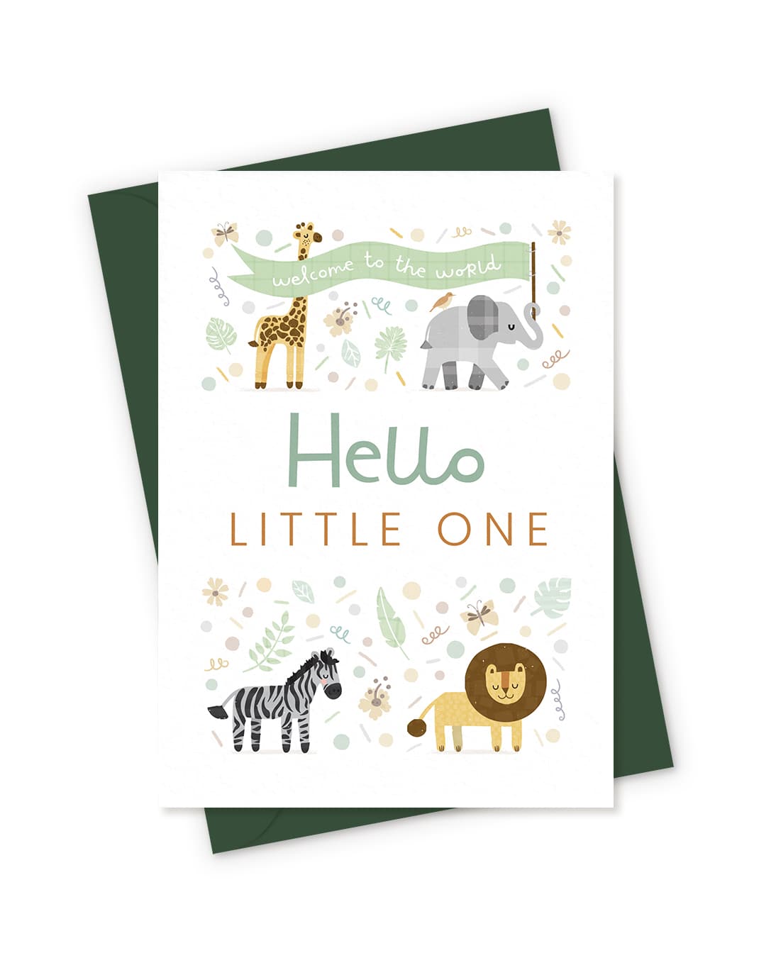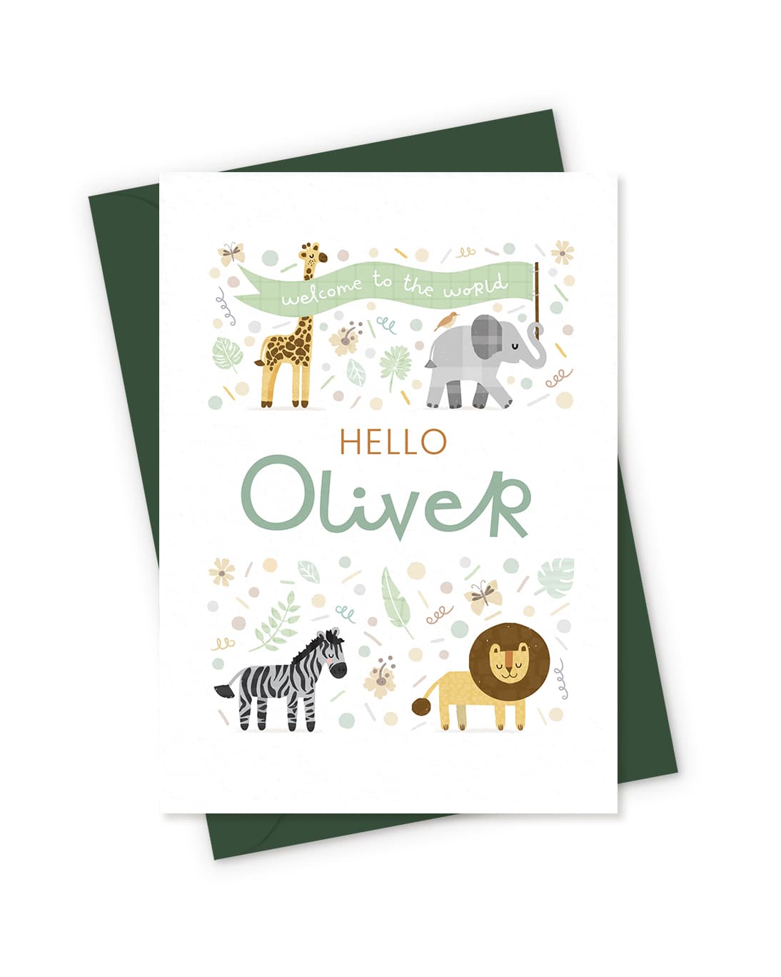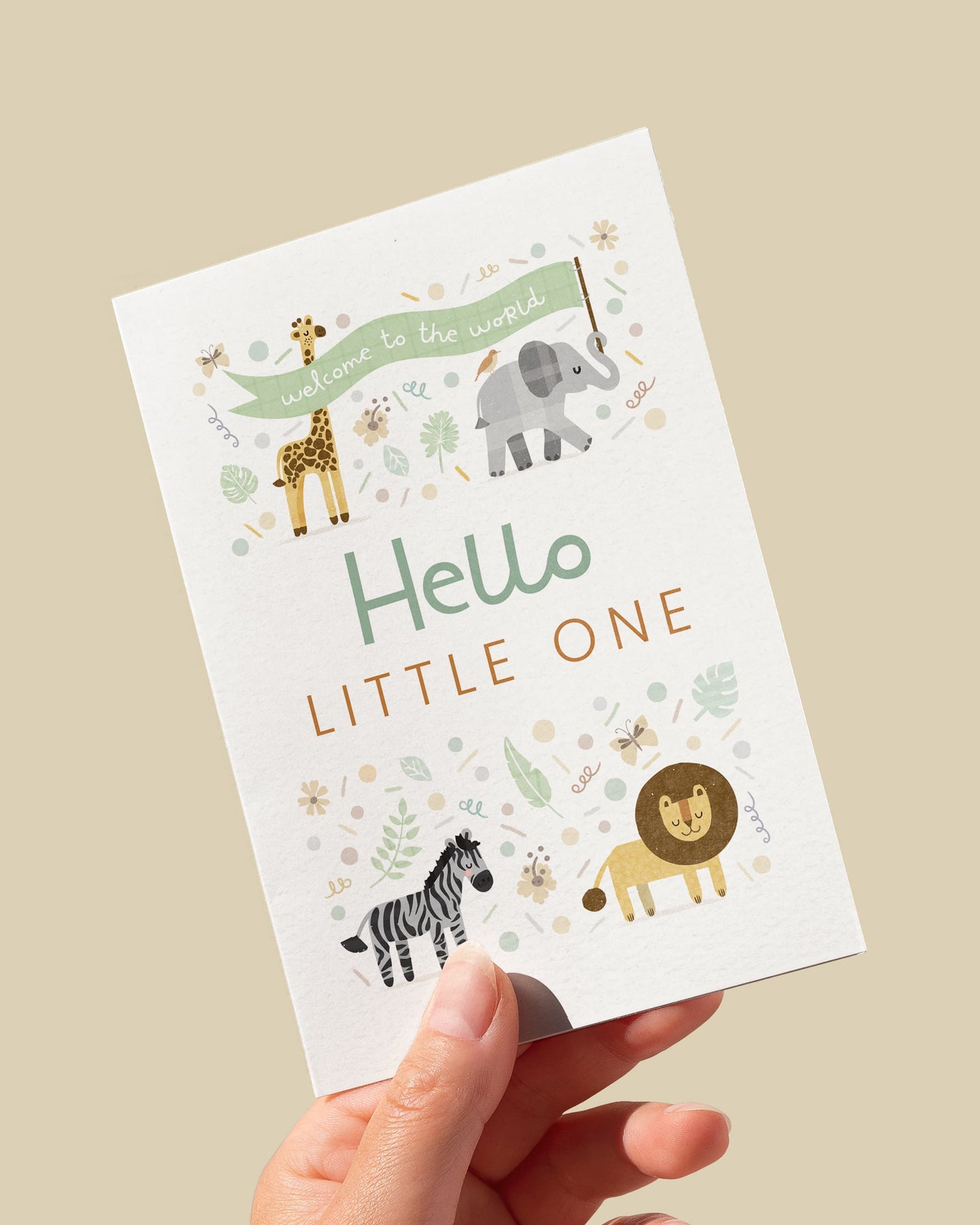 This card is a joyful celebration, featuring a whole parade of my hand-drawn safari animals. I wanted to create a rich, detailed scene full of gentle friends and subtle, earthy patterns. It's a vibrant and happy design, perfect for welcoming a special new arrival.