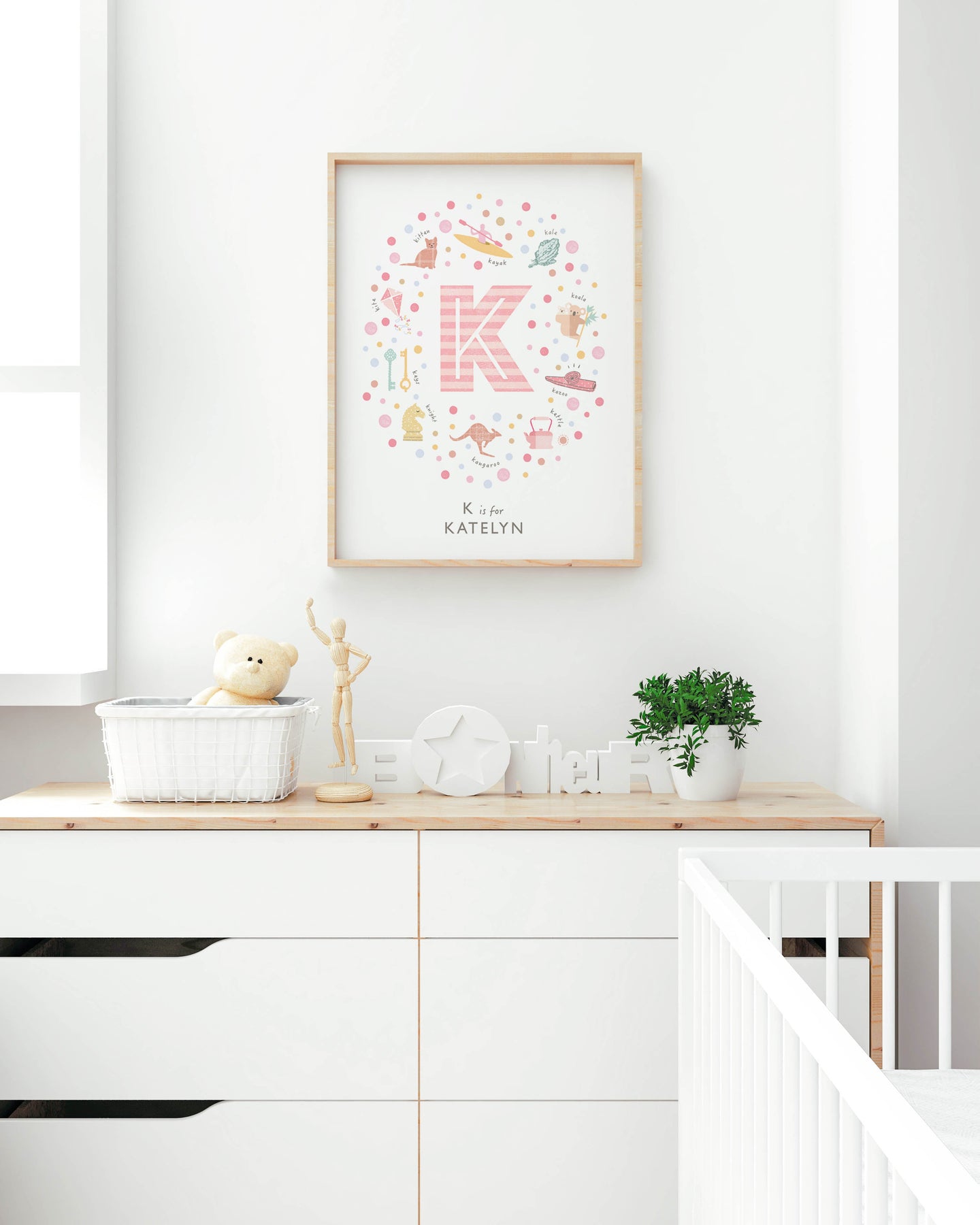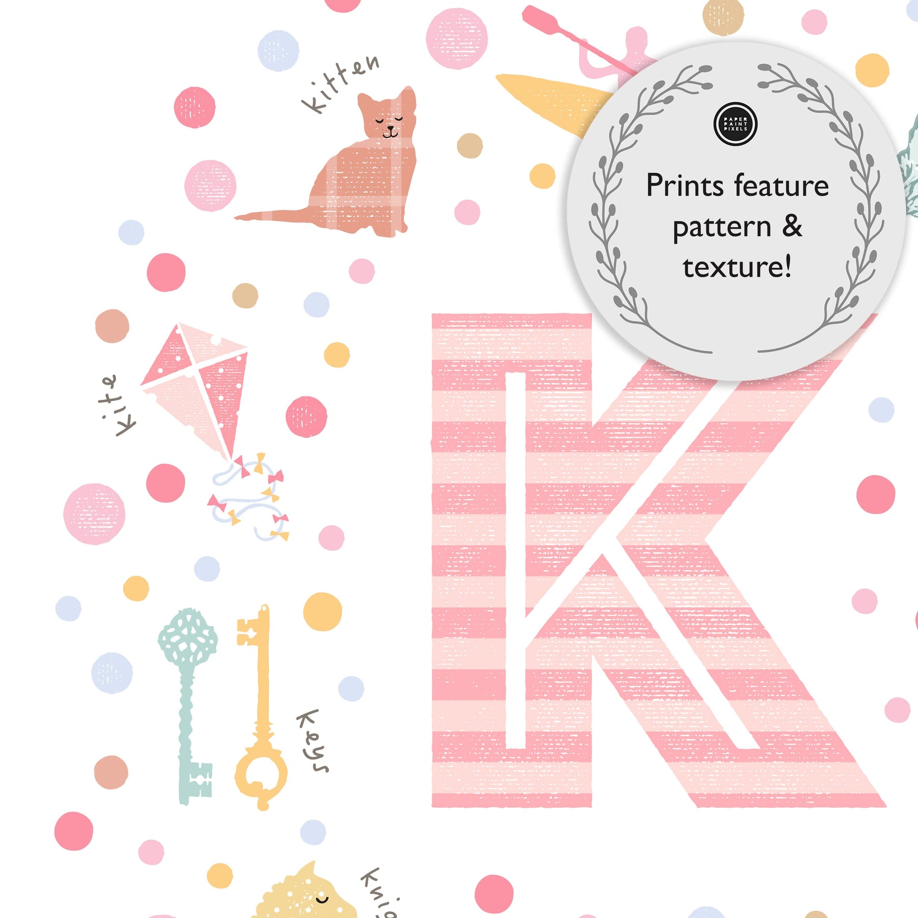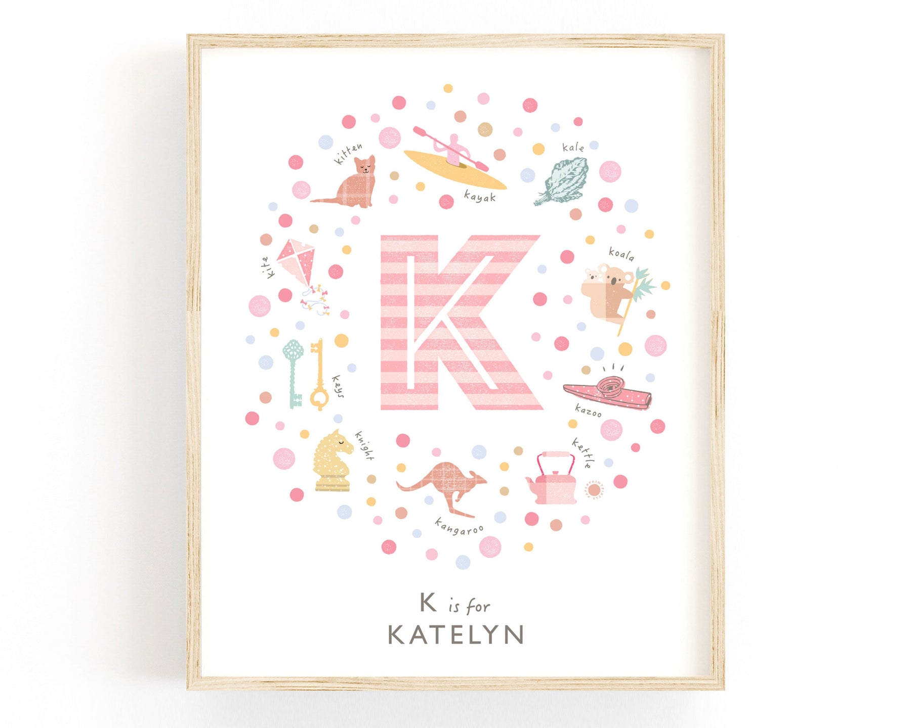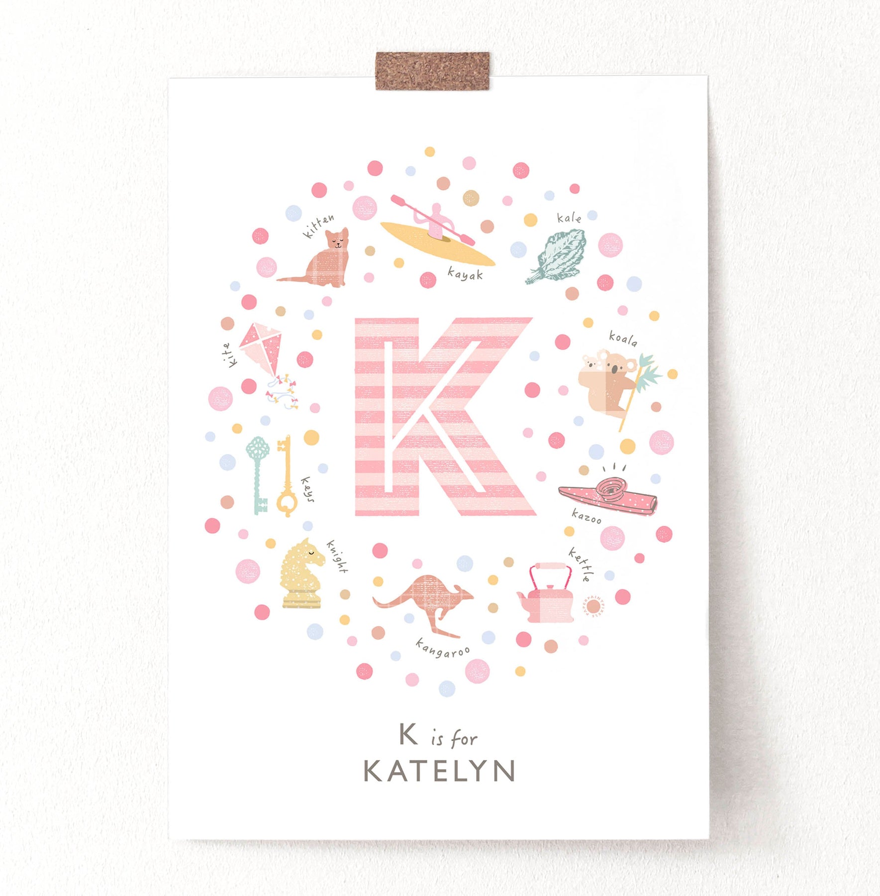 A sweet pink personalised print beautifully illustrated with cute things beginning with the Letter K! The illustrations are - K is for Kitten, Kayak, Kale, Koala, Kazoo, Kettle, Kangaroo, Knight, Keys and Kite.