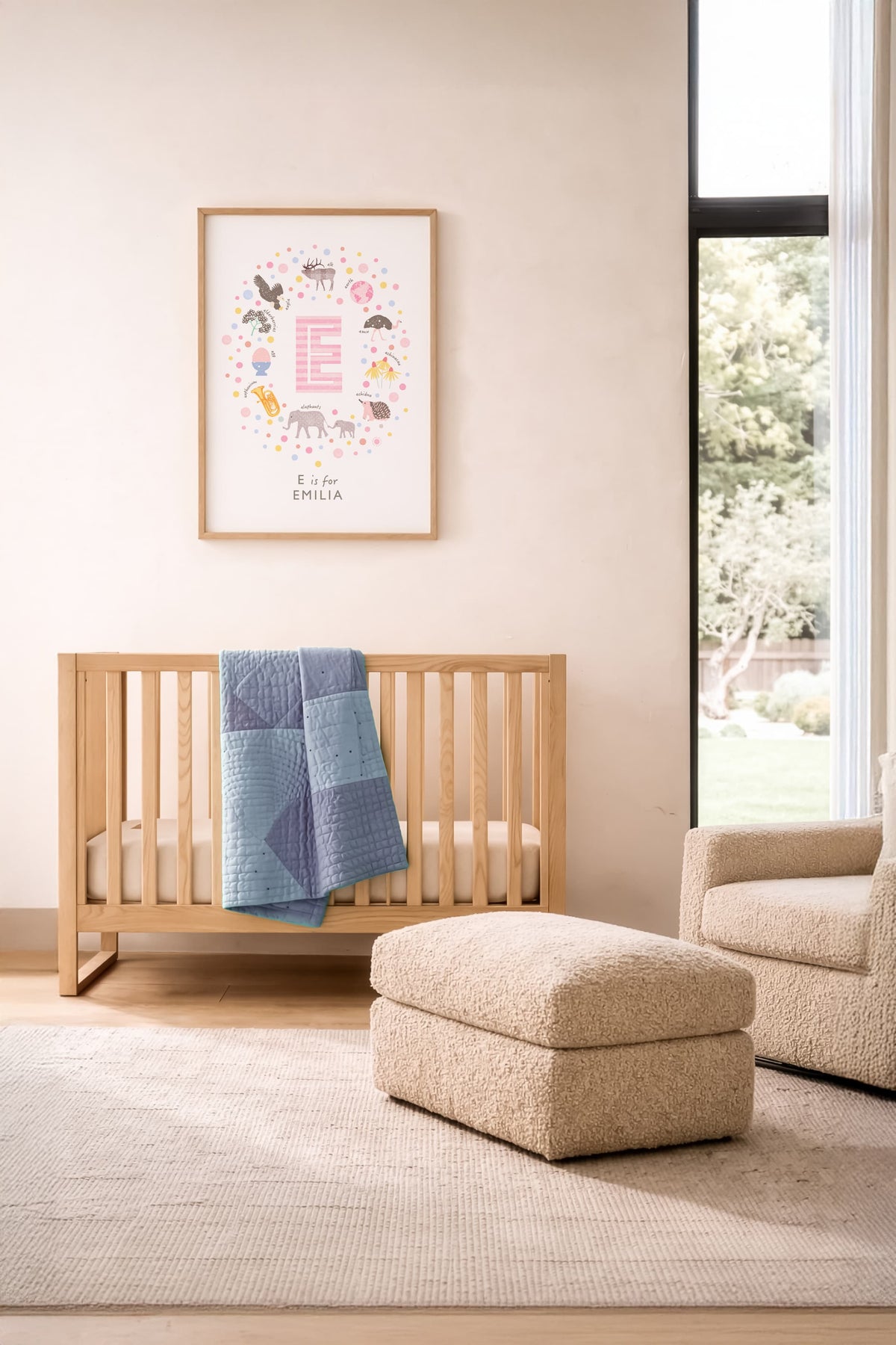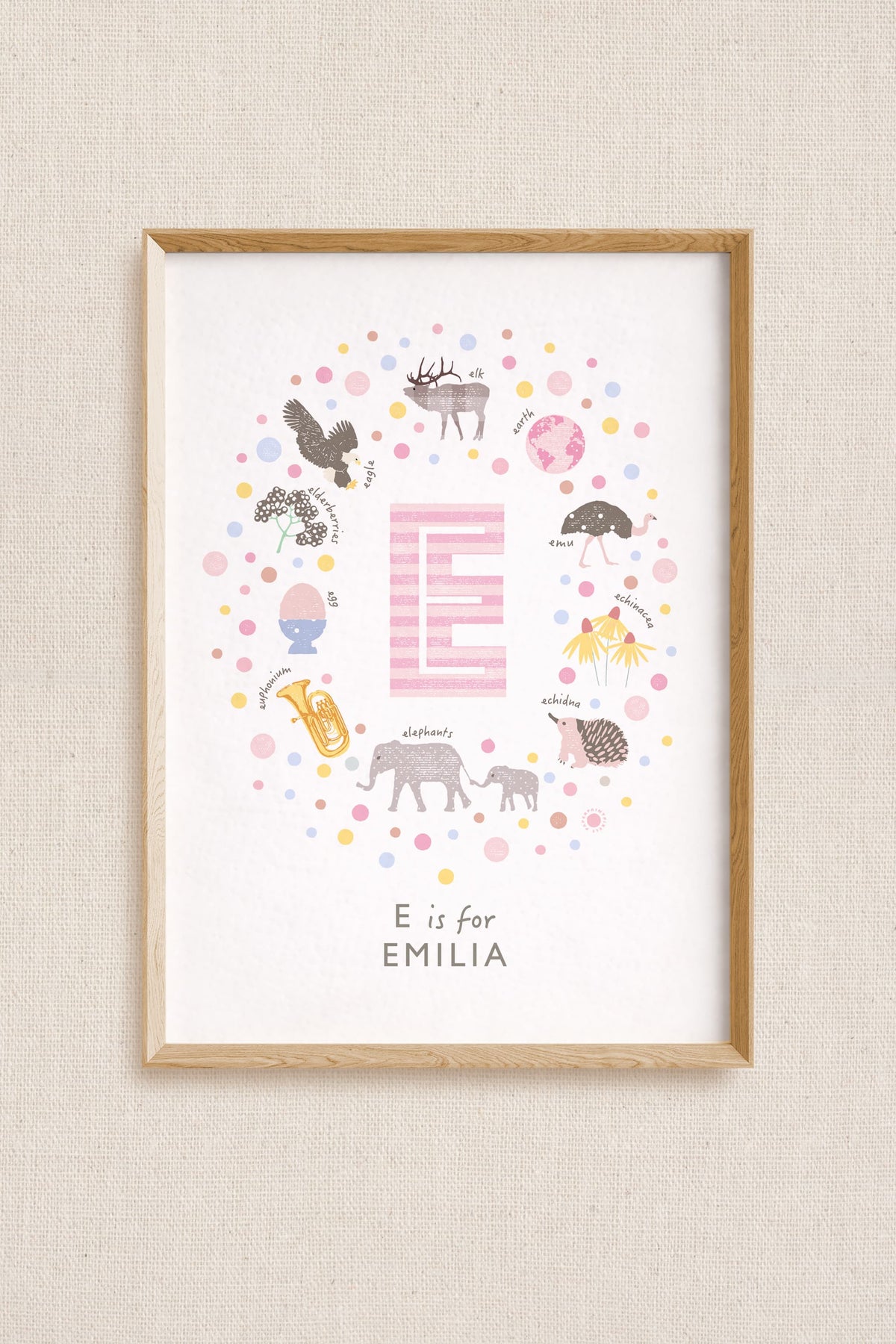 This pink personalised initial name print features a whimsical collection of things beginning with the Letter E: Elk, Earth, Emu, Elf, Echidna, Elephant, Euphonium, Egg, Elderberries, and Eagle. Your chosen name is beautifully printed underneath.