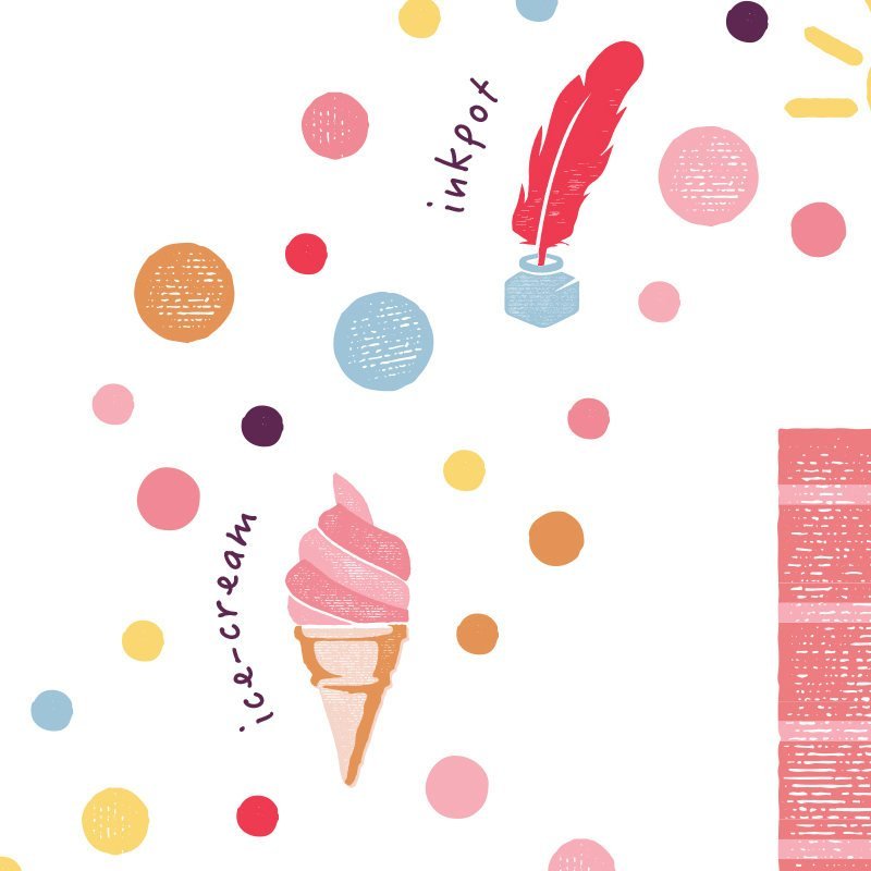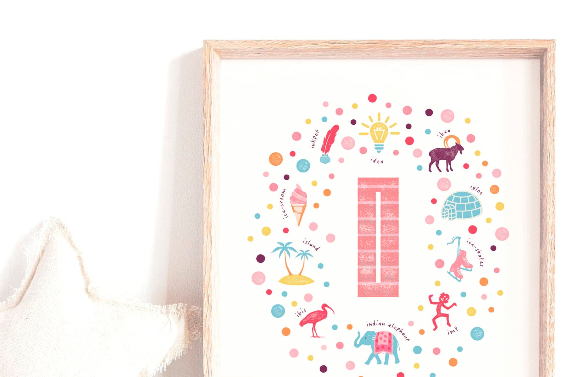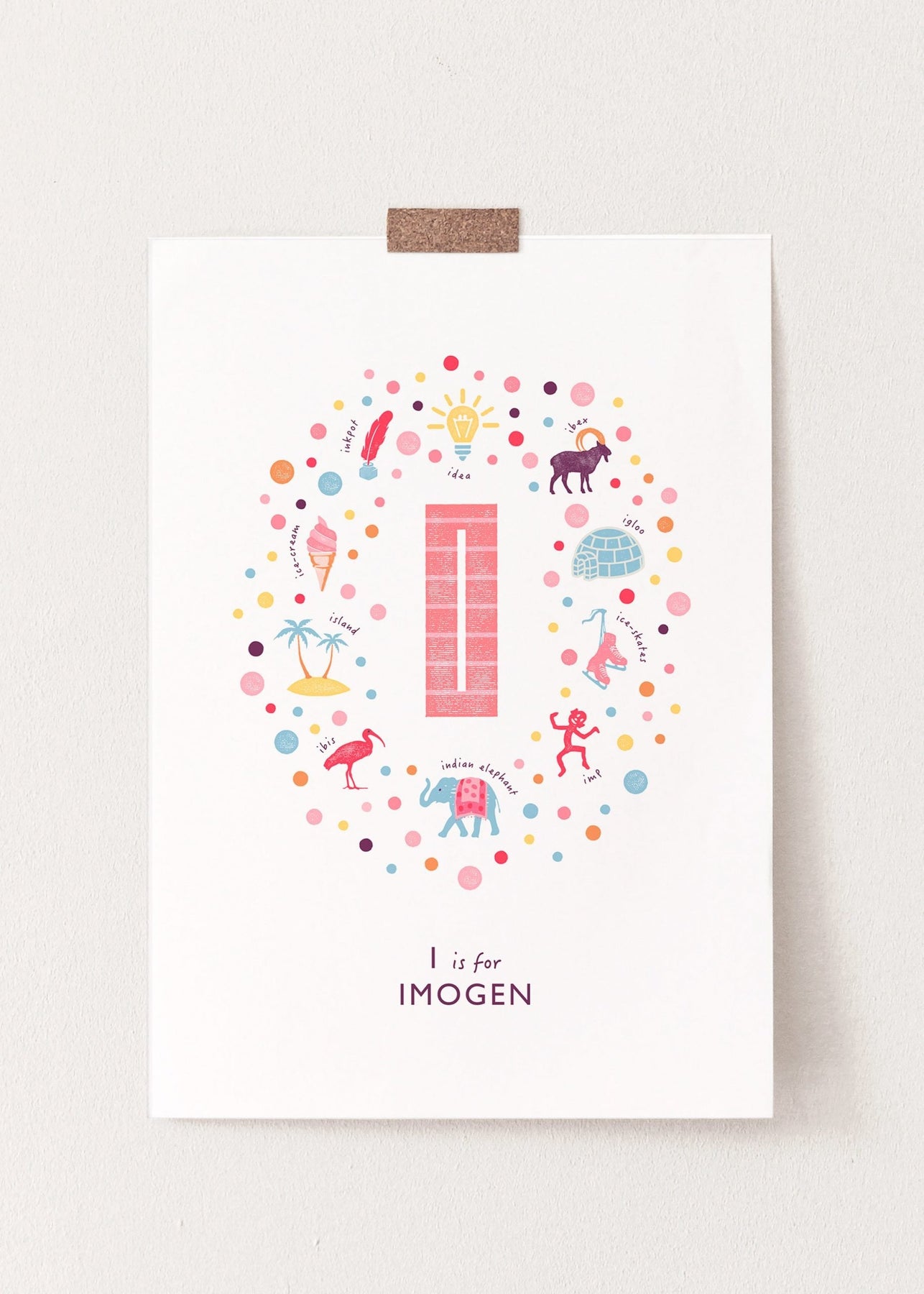 A gorgeous personalised nursery print beautifully illustrated with cute things beginning with the Letter I. I is for Ice Skates, Island, Idea, Ibis, Ibex, Indian Elephant, Inkpot, Ice Cream, Igloo and you choose the name underneath.
