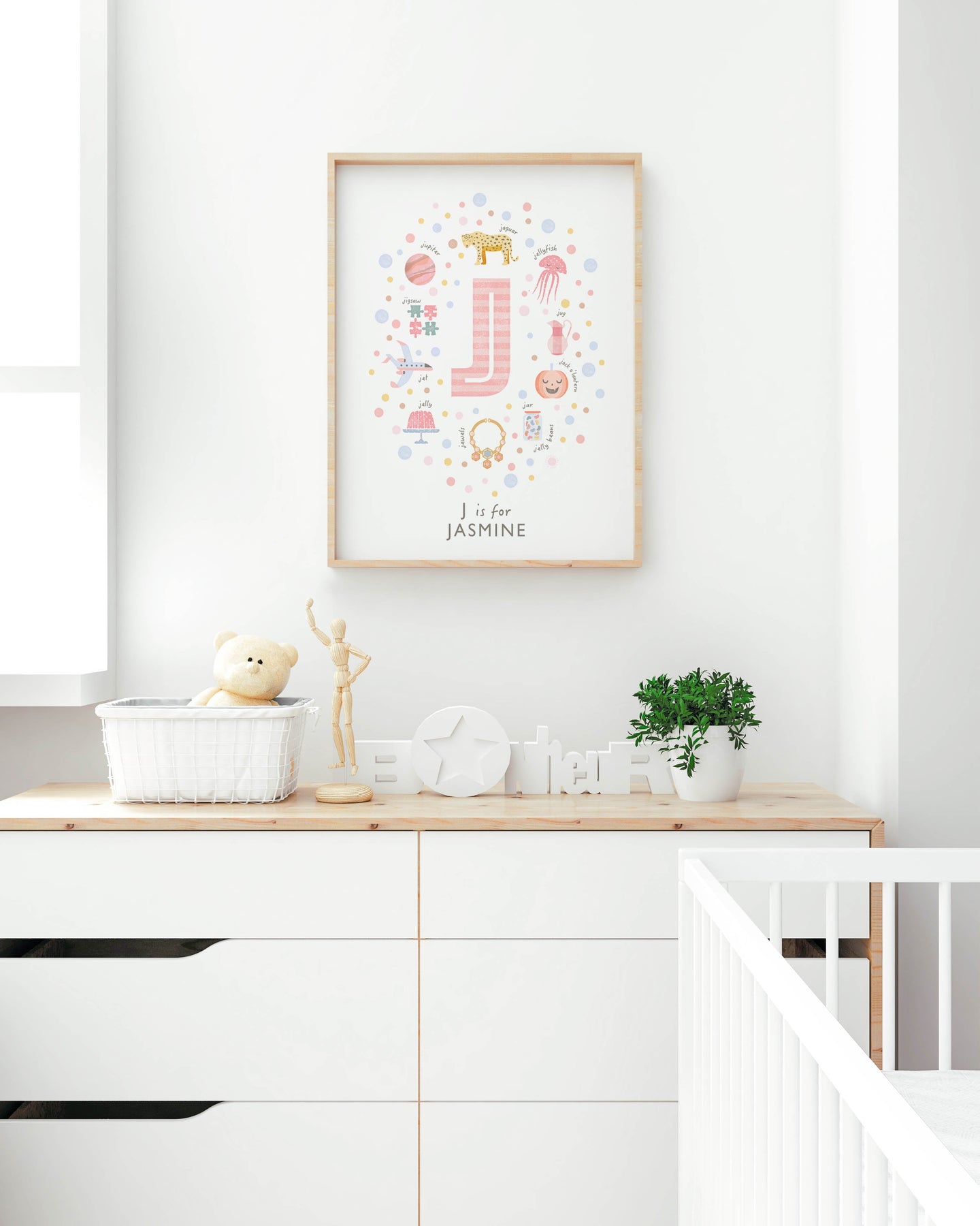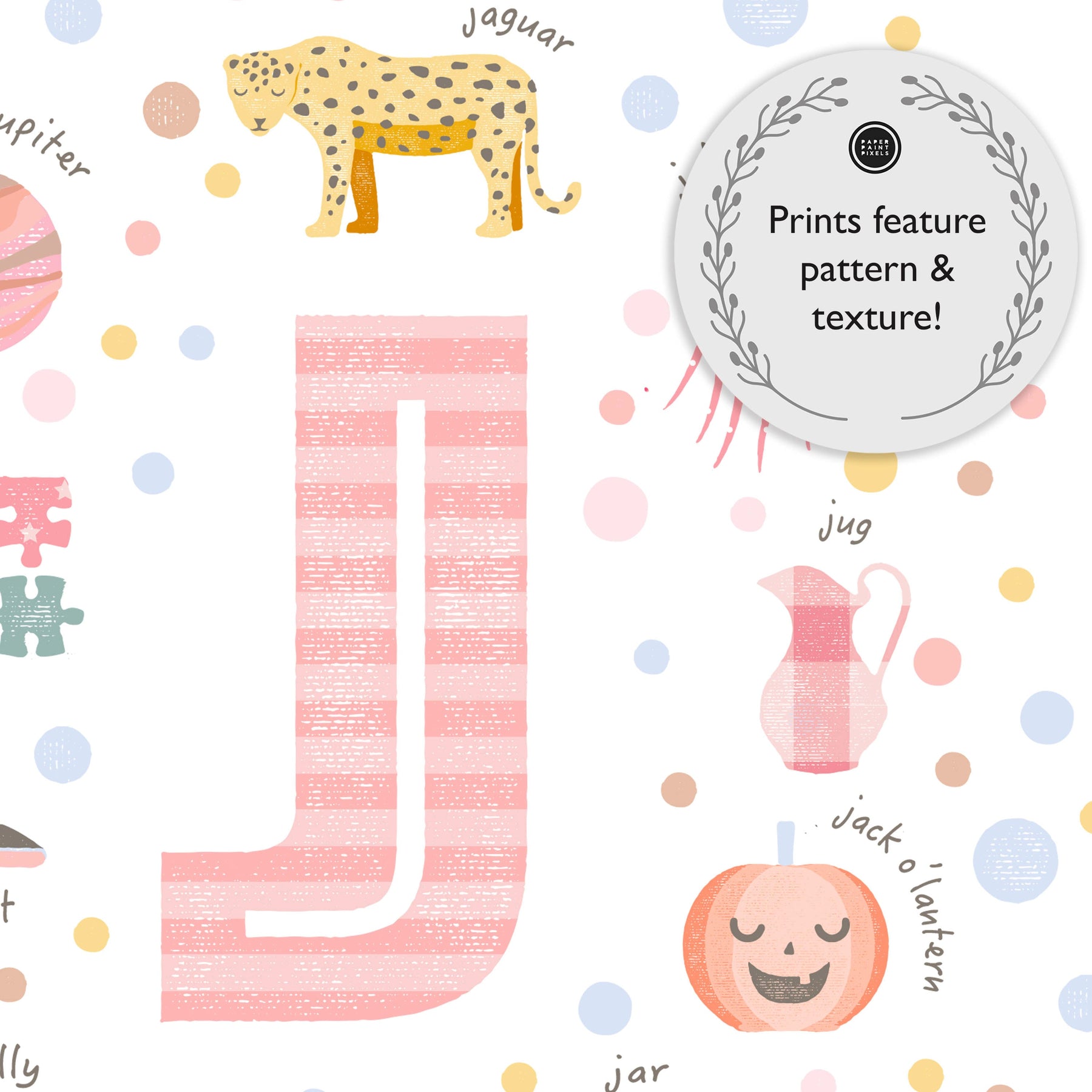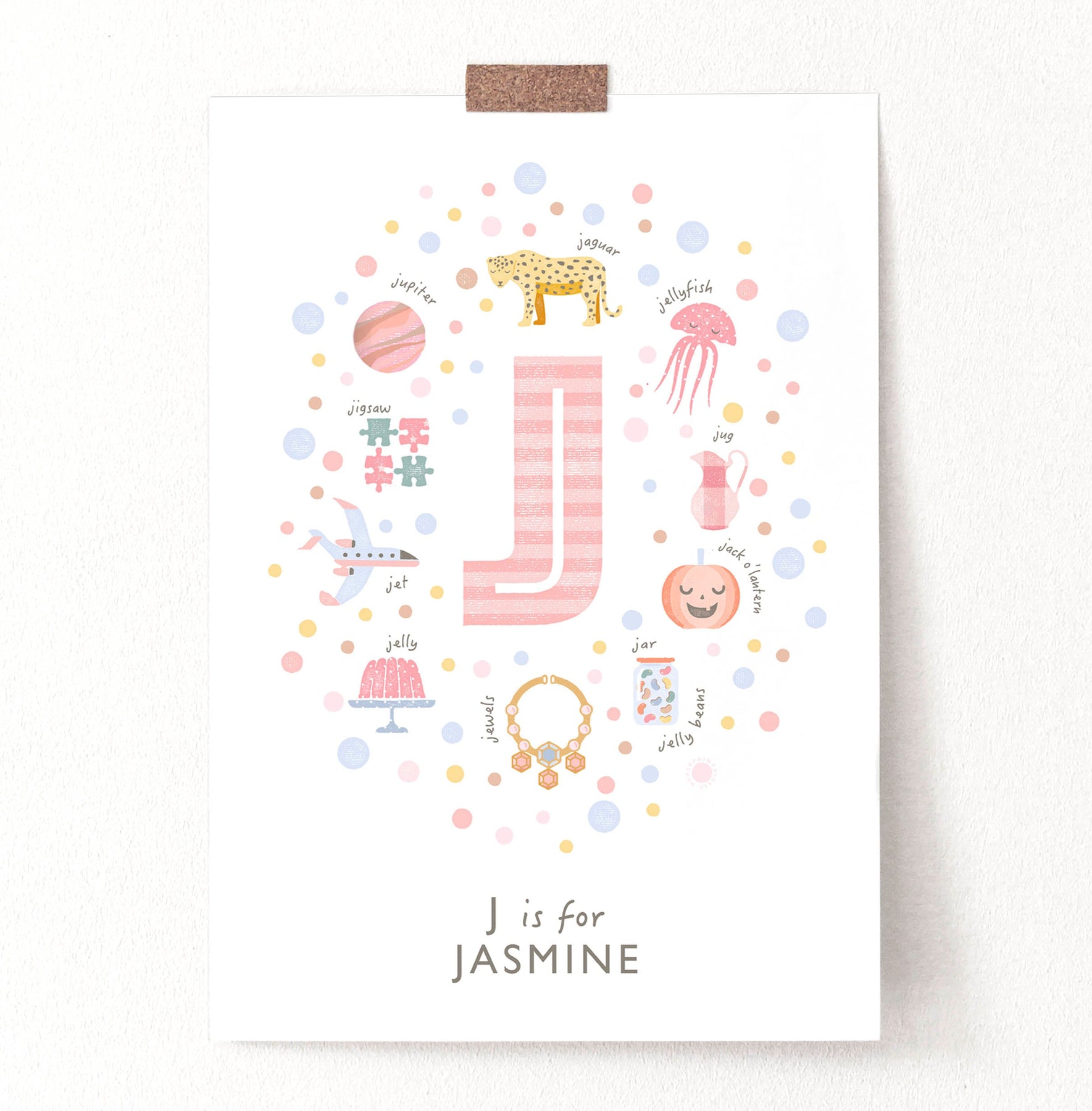 A gorgeous pink girls personalised print beautifully illustrated with cute things beginning with the Letter J! The illustrations are - J is for Jug, Jack ' O' Lantern, Jupiter, Jaguar, Jewel, Junk, Jellyfish. Jelly and Jet.