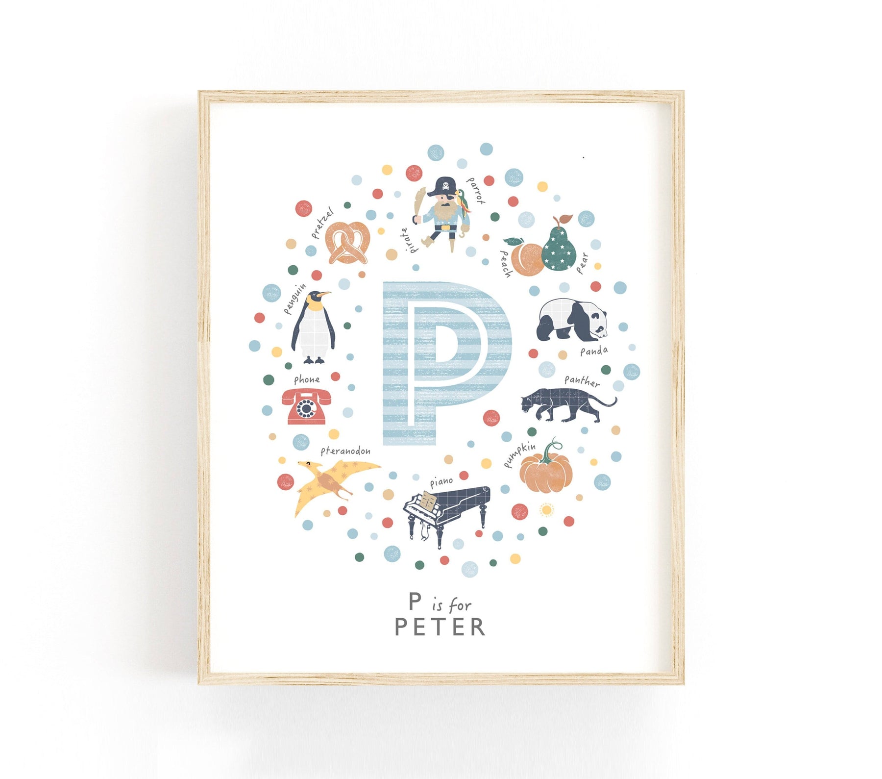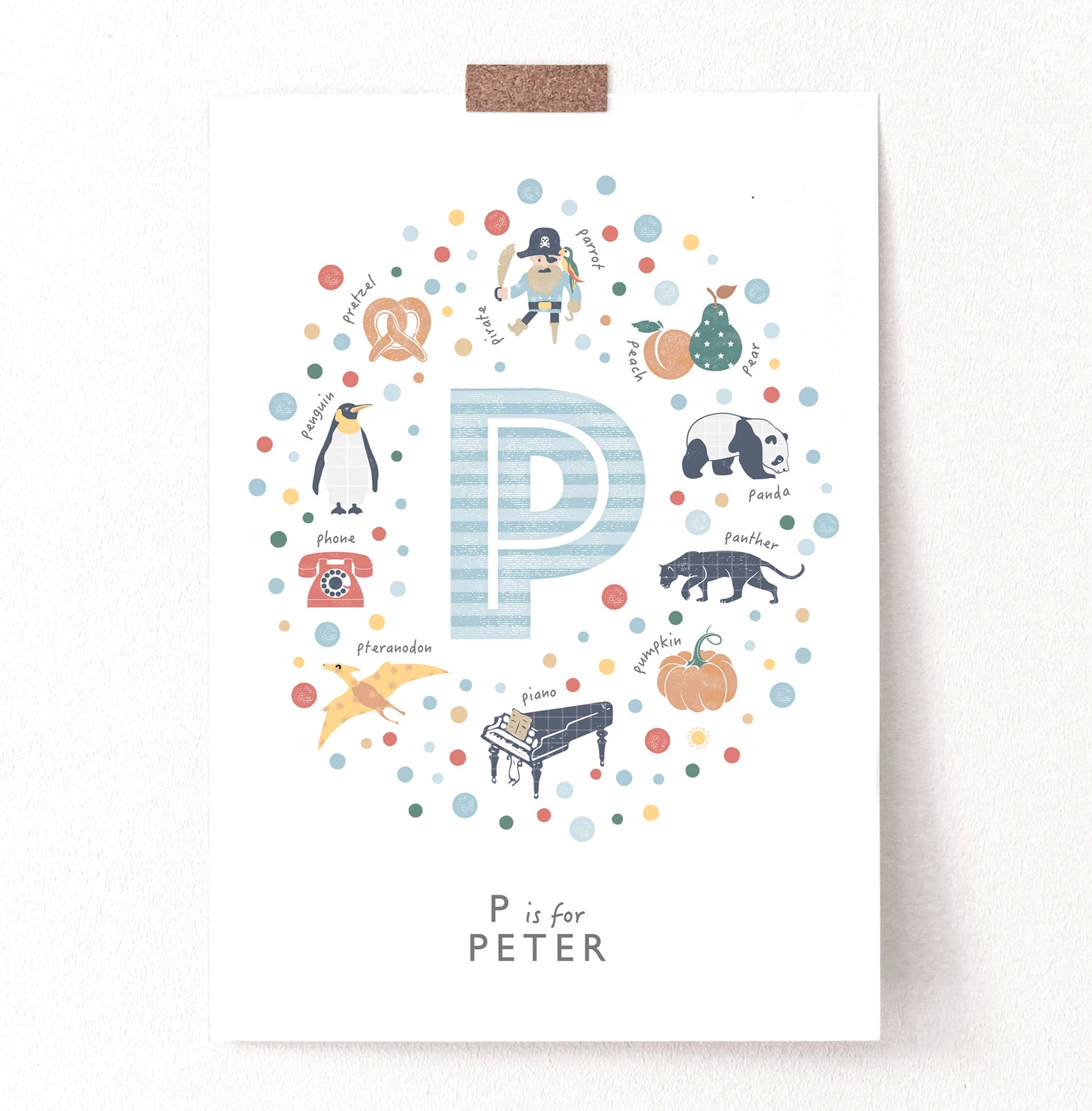A sweet personalised print beautifully illustrated with cute things beginning with the Letter P! The illustrations are - P is for pteranodon, pretzel, piano, panda, pirate, pumpkin peach, pear and panther.
