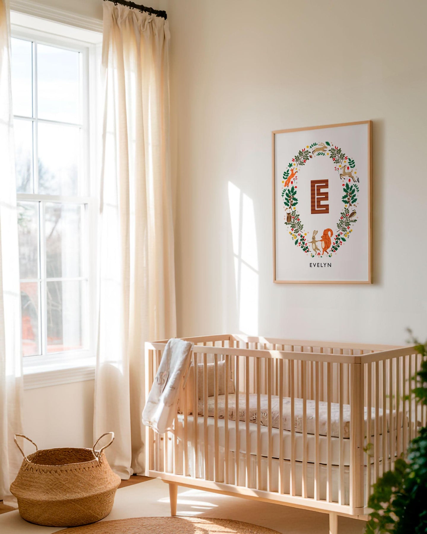 Pair this personalised woodland wreath nursery print with the matching Woodland Alphabet Print for a complete nature-inspired look in your little one's room! Explore the coordinating designs to create a beautifully cohesive and enchanting space.