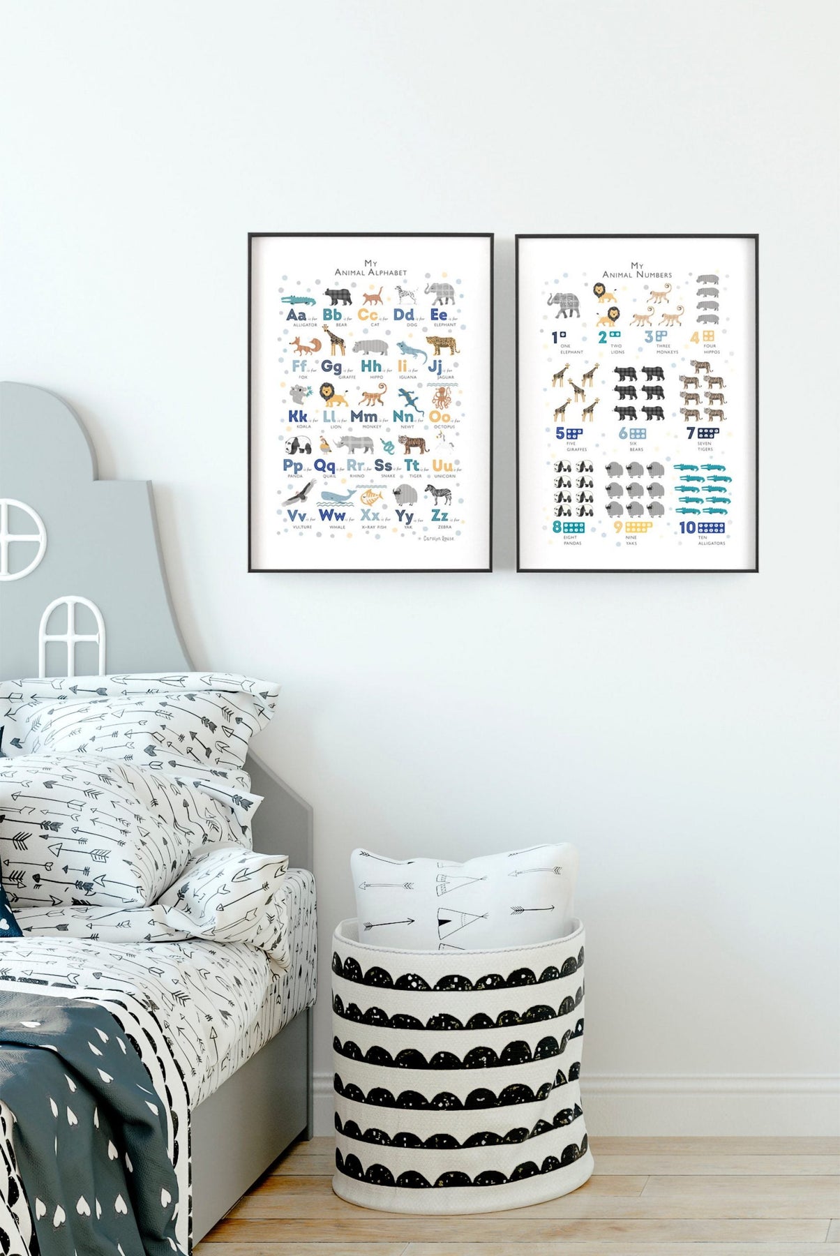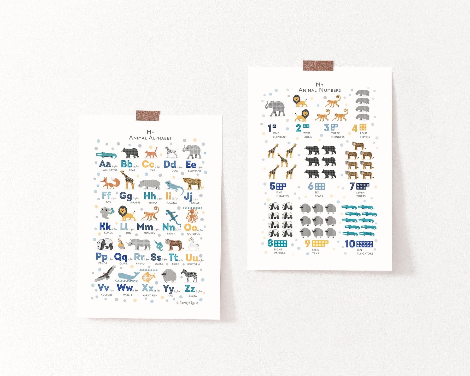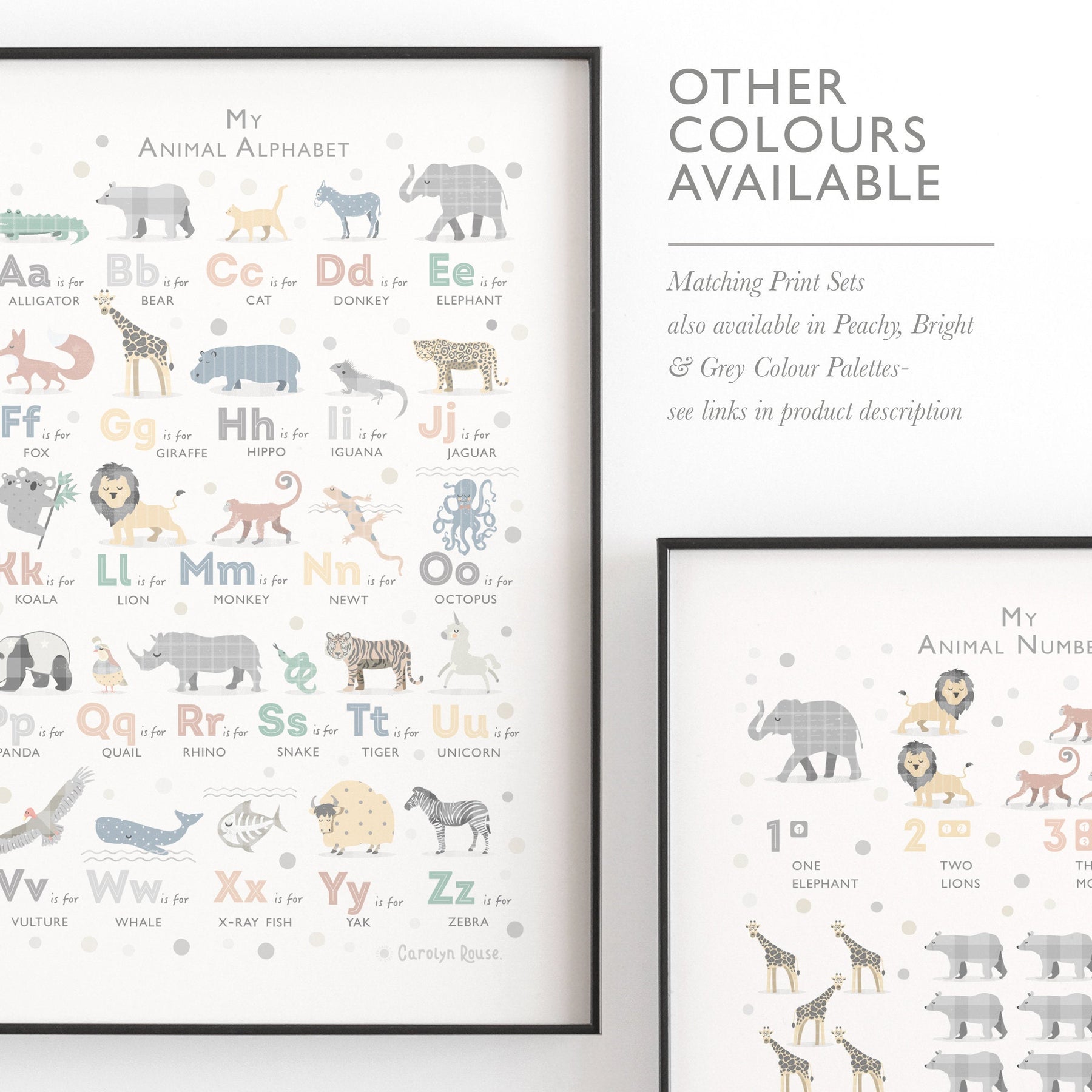 Add a touch of safari animal magic to your home with this cute whimsical Animal Alphabet and Numbers Print Set in gorgeous blues, teals and mustard colours, it's perfect in any modern nursery.