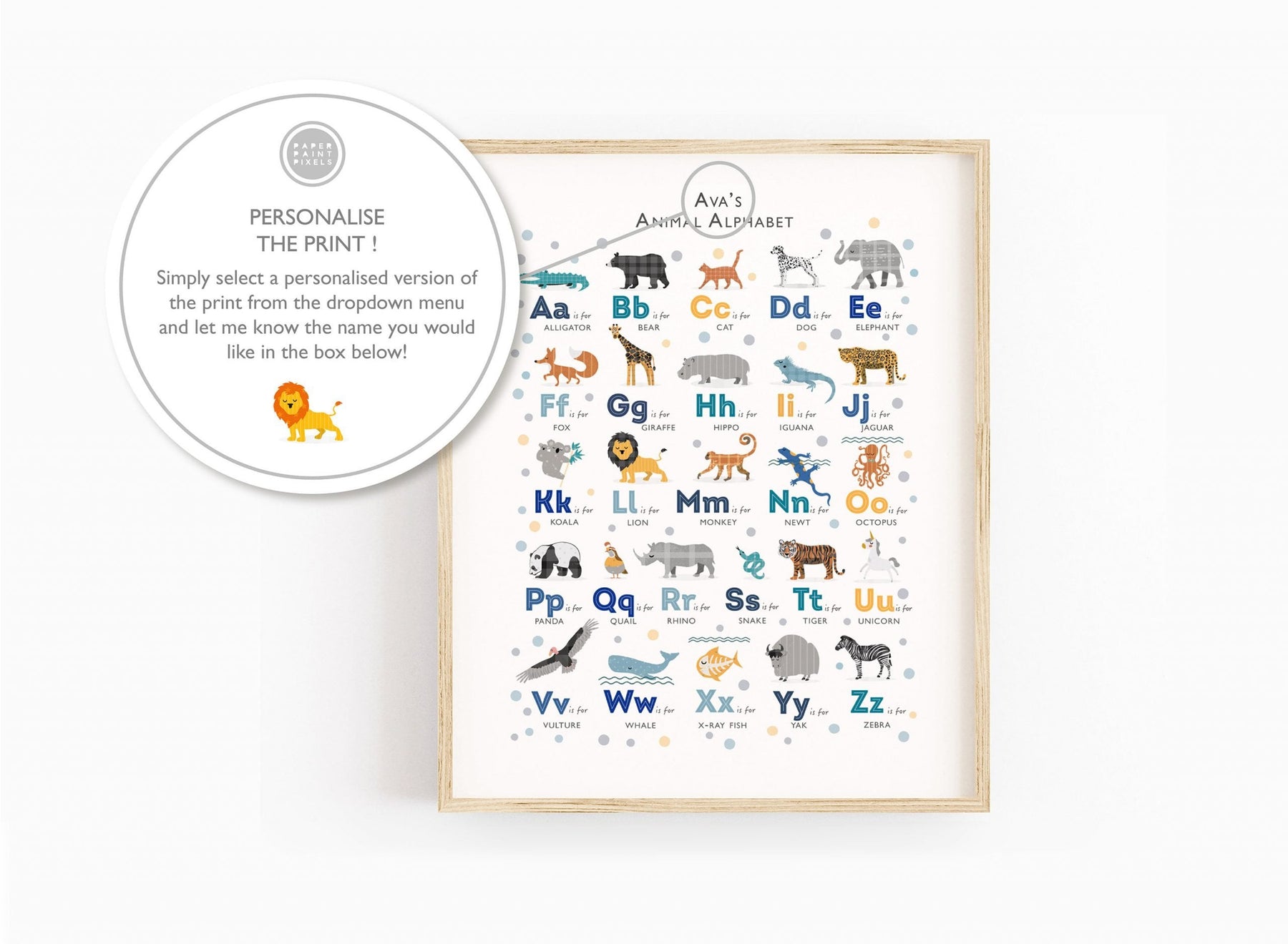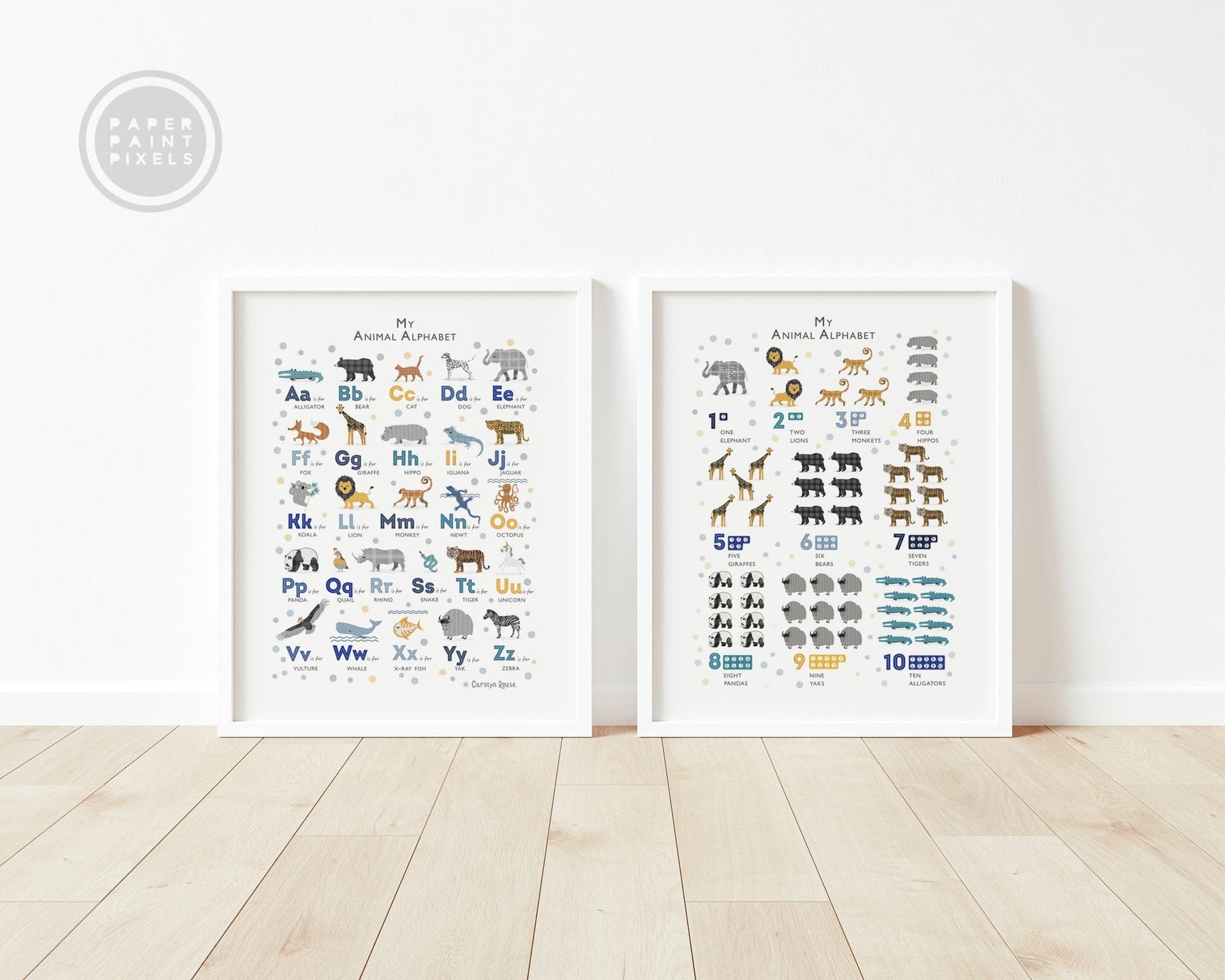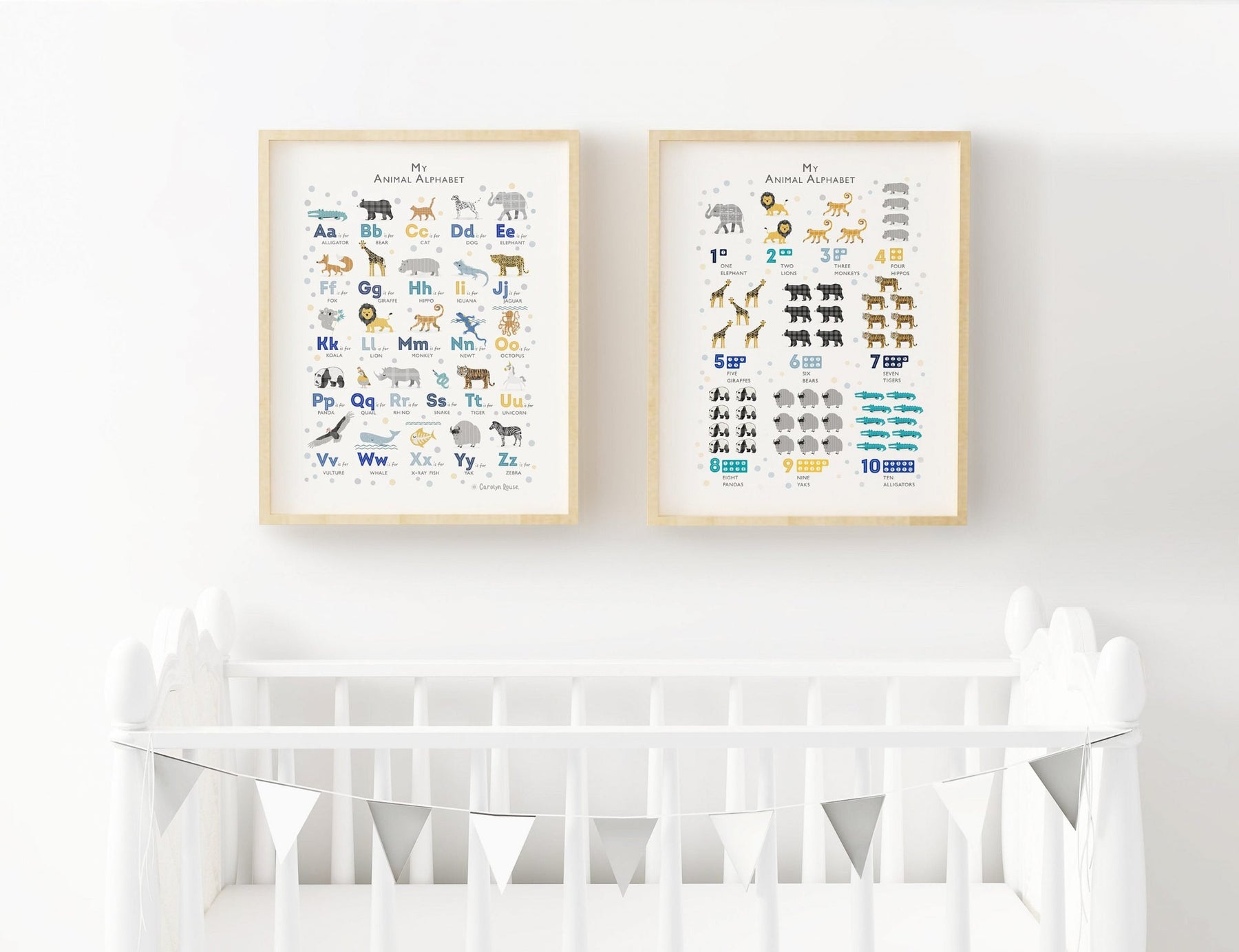 Add a touch of safari animal magic to your home with this cute whimsical Animal Alphabet and Numbers Print Set in gorgeous blues, teals and mustard colours, it's perfect in any modern nursery.