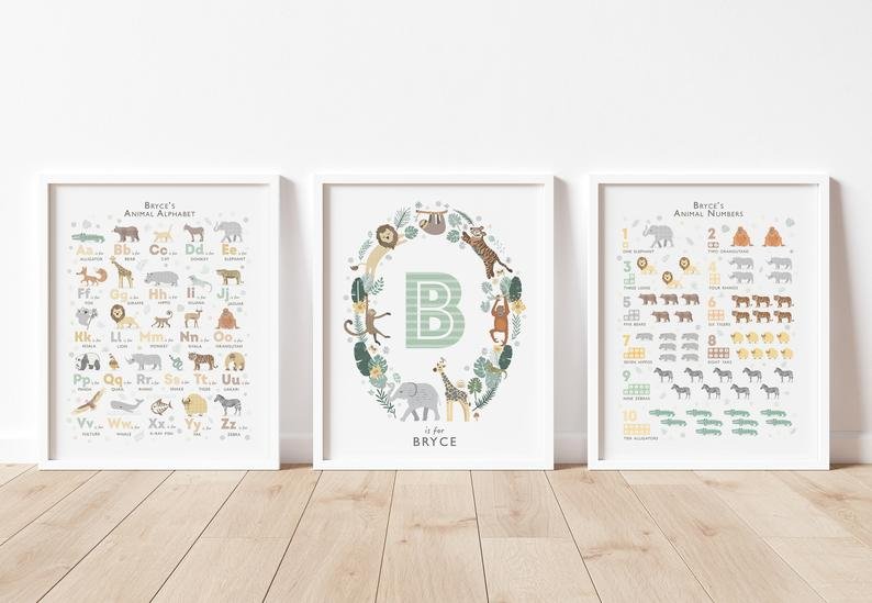 A super cute set of 3 Personalised Safari Nursery Prints for your little ones nursery or playroom. Add a touch of the wild to your kiddo's room. These gorgeous educational prints encourage conversation and learning everyday. Perfect for a thoughtful new baby gift or toddler birthday surprise.