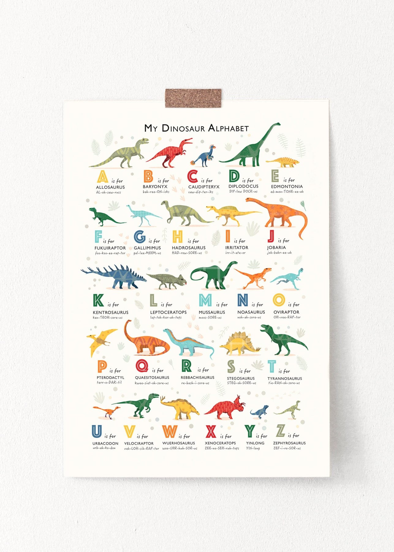 An alphabet for aspiring palaeontologists and curious minds. I've illustrated this A-Z with a dinosaur for every letter, from the mighty Allosaurus to the gentle Zigongosaurus. Each one is drawn with a softer, more characterful touch, reimagining this educational classic as a piece of art that will live happily on their wall.