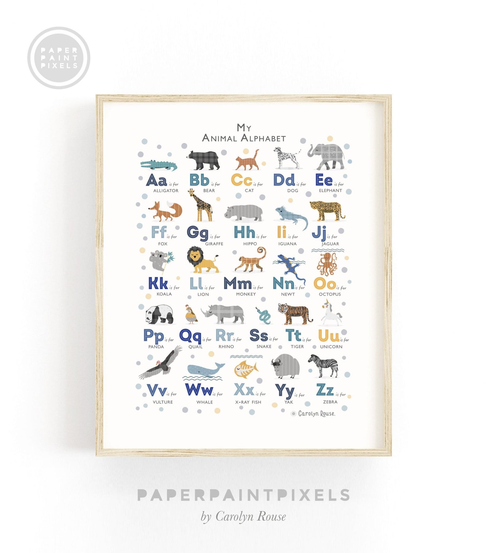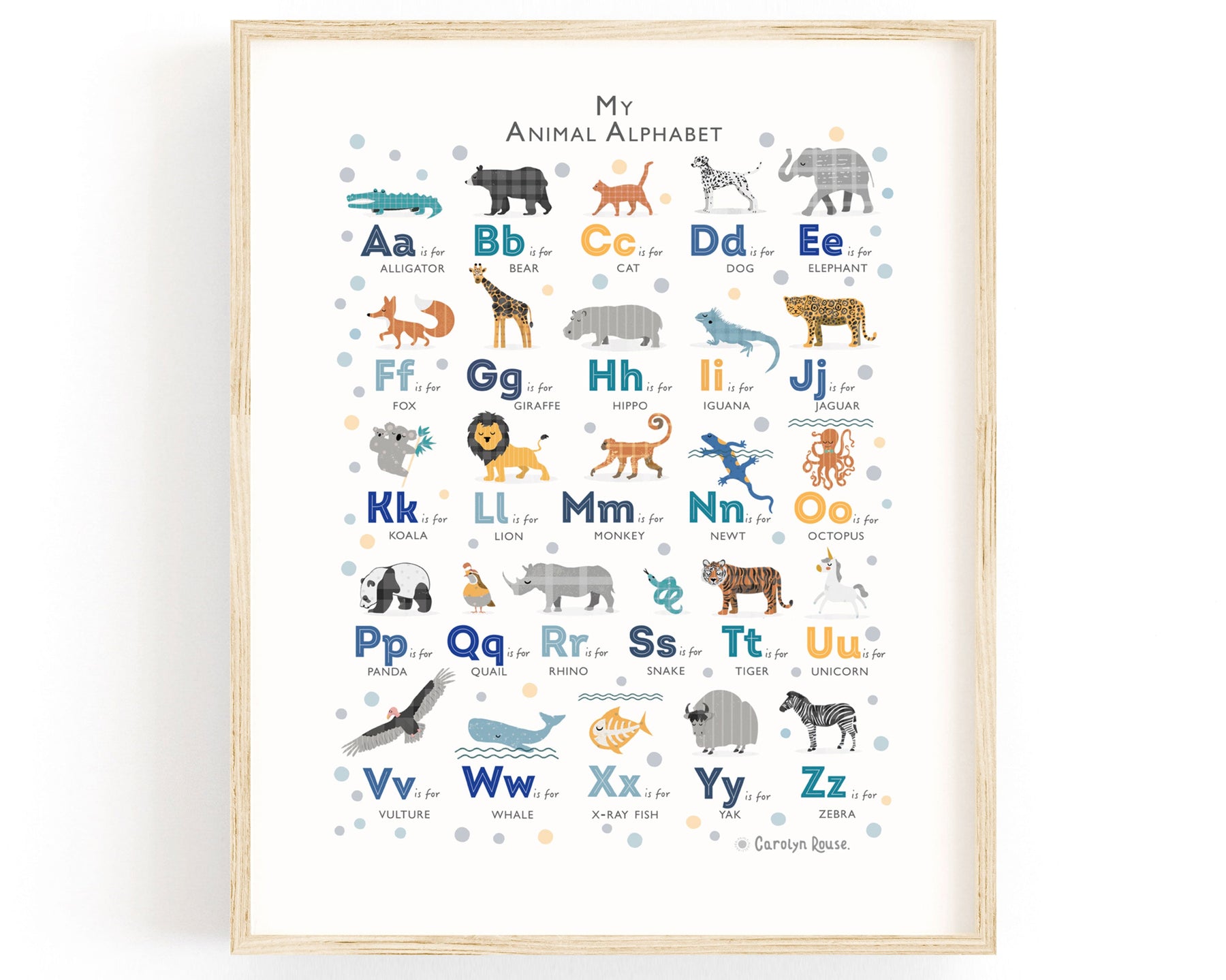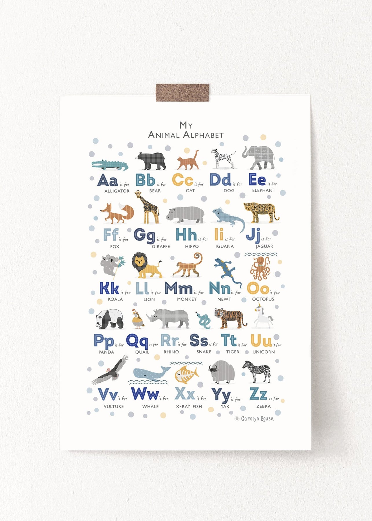 Add a sprinkle of animal magic to your little one's room with this whimsical Animal Alphabet Print in gorgeous blues with a dash of mustard, perfect in any modern nursery. This quality art print features original illustrations by Carolyn Rouse and is super educational and fun.