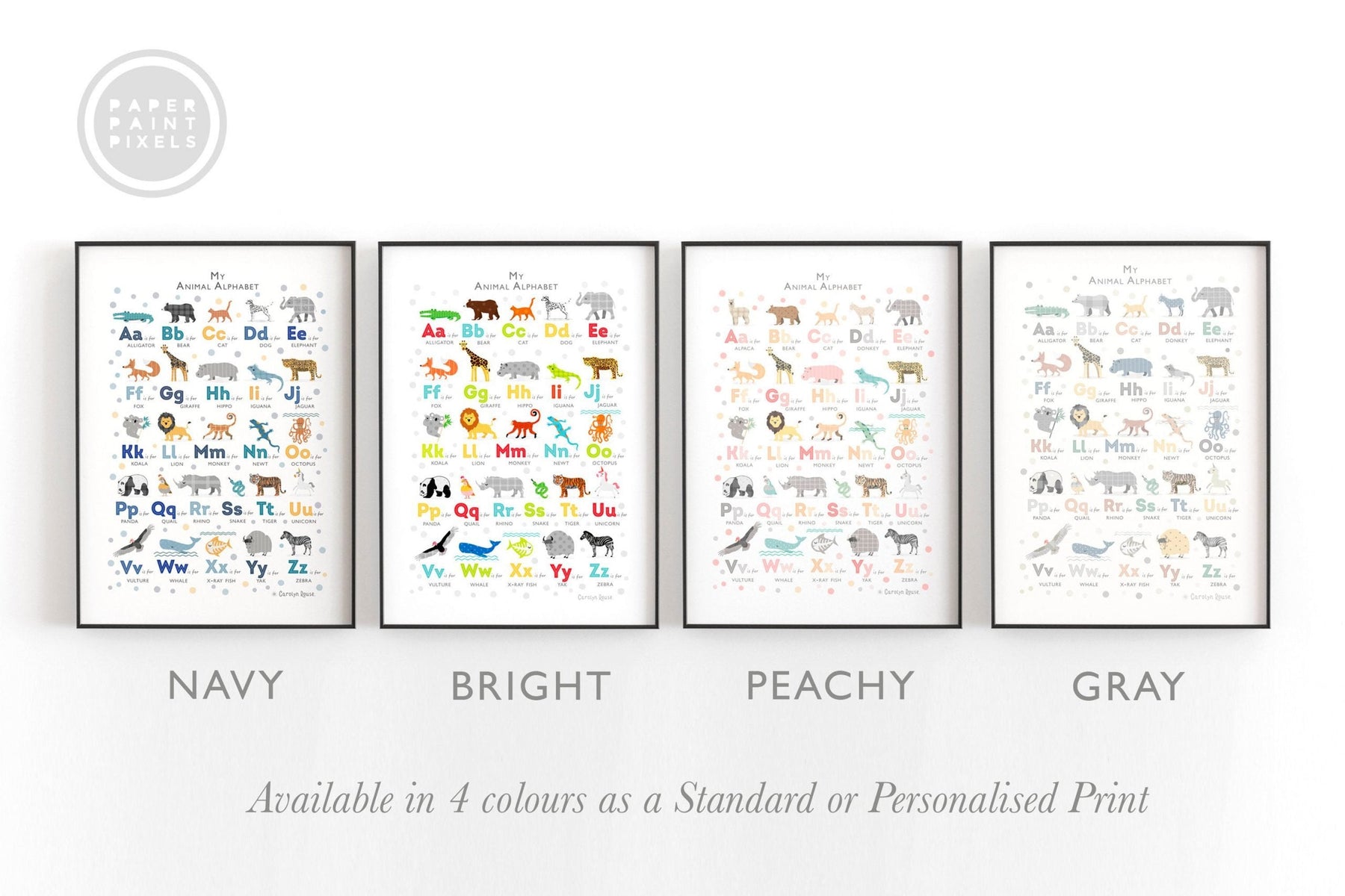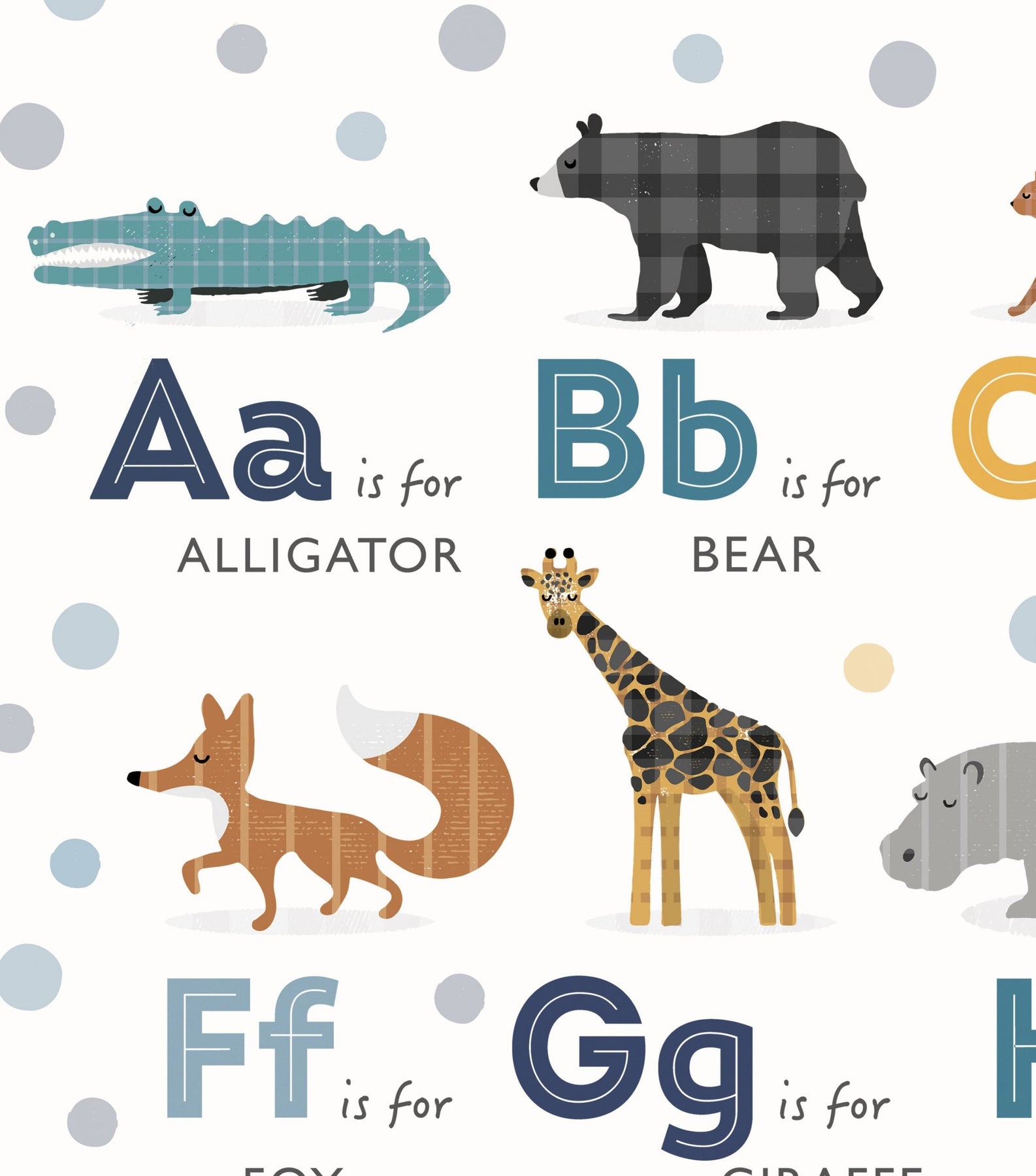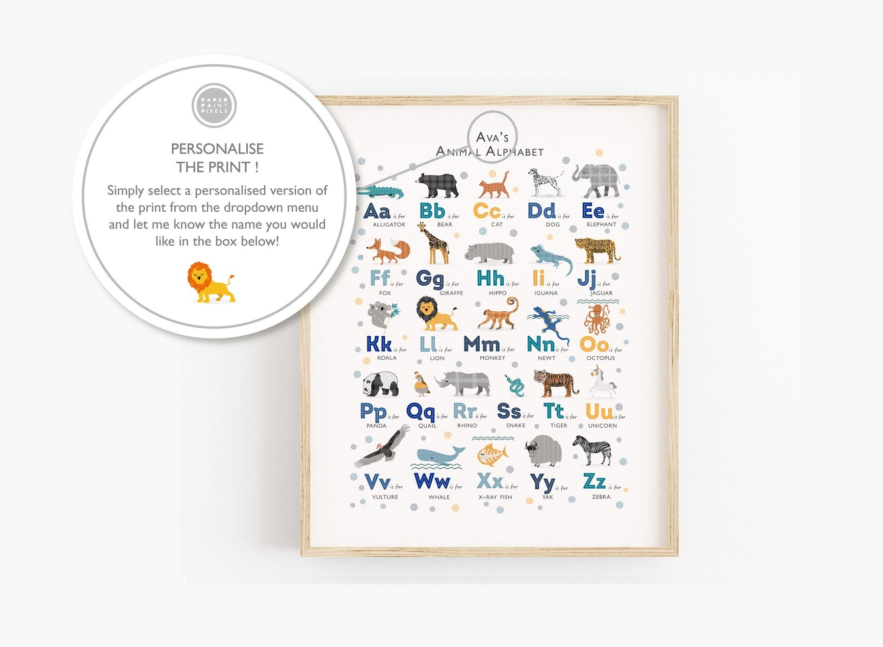 Add a sprinkle of animal magic to your little one's room with this whimsical Animal Alphabet Print in gorgeous blues with a dash of mustard, perfect in any modern nursery. This quality art print features original illustrations by Carolyn Rouse and is super educational and fun.