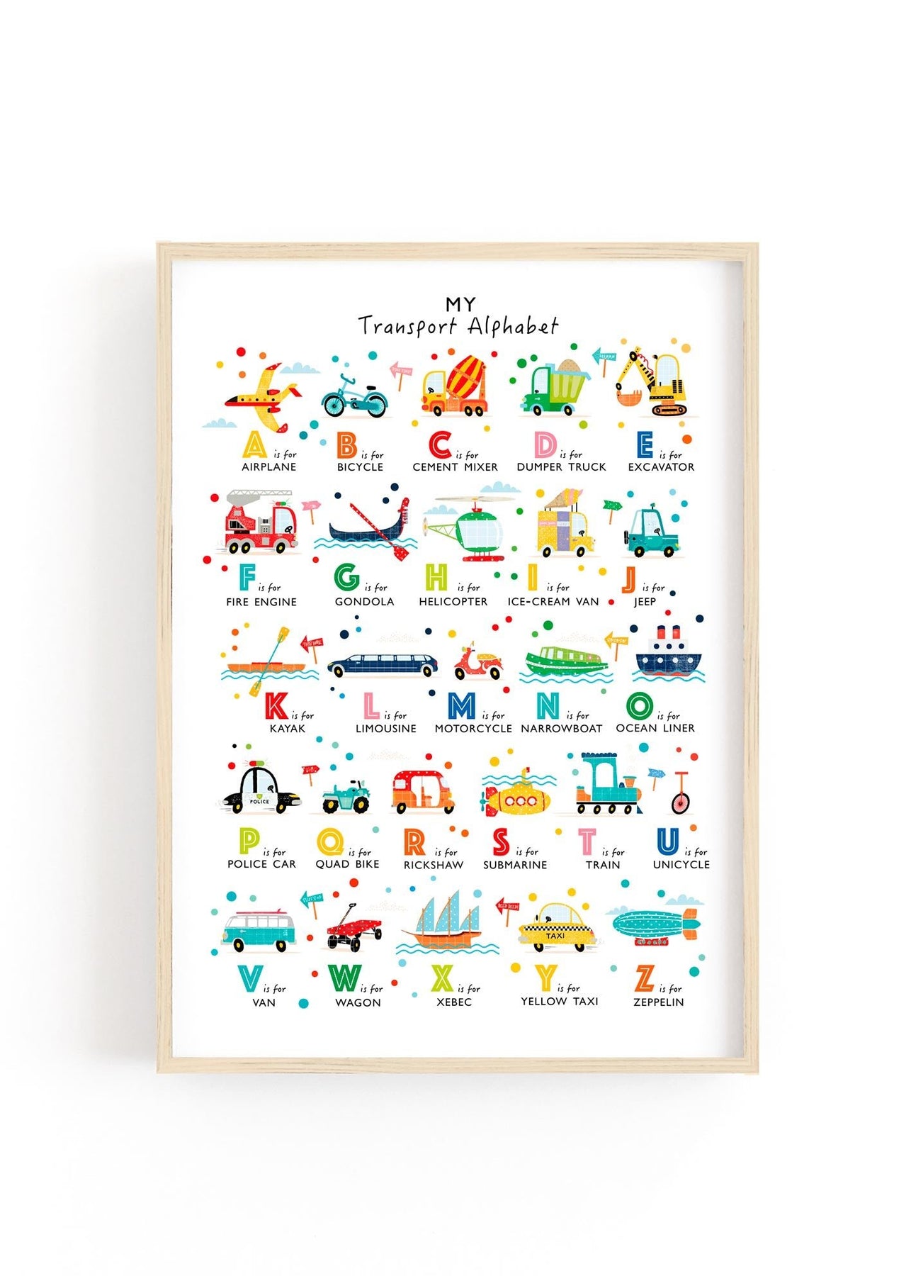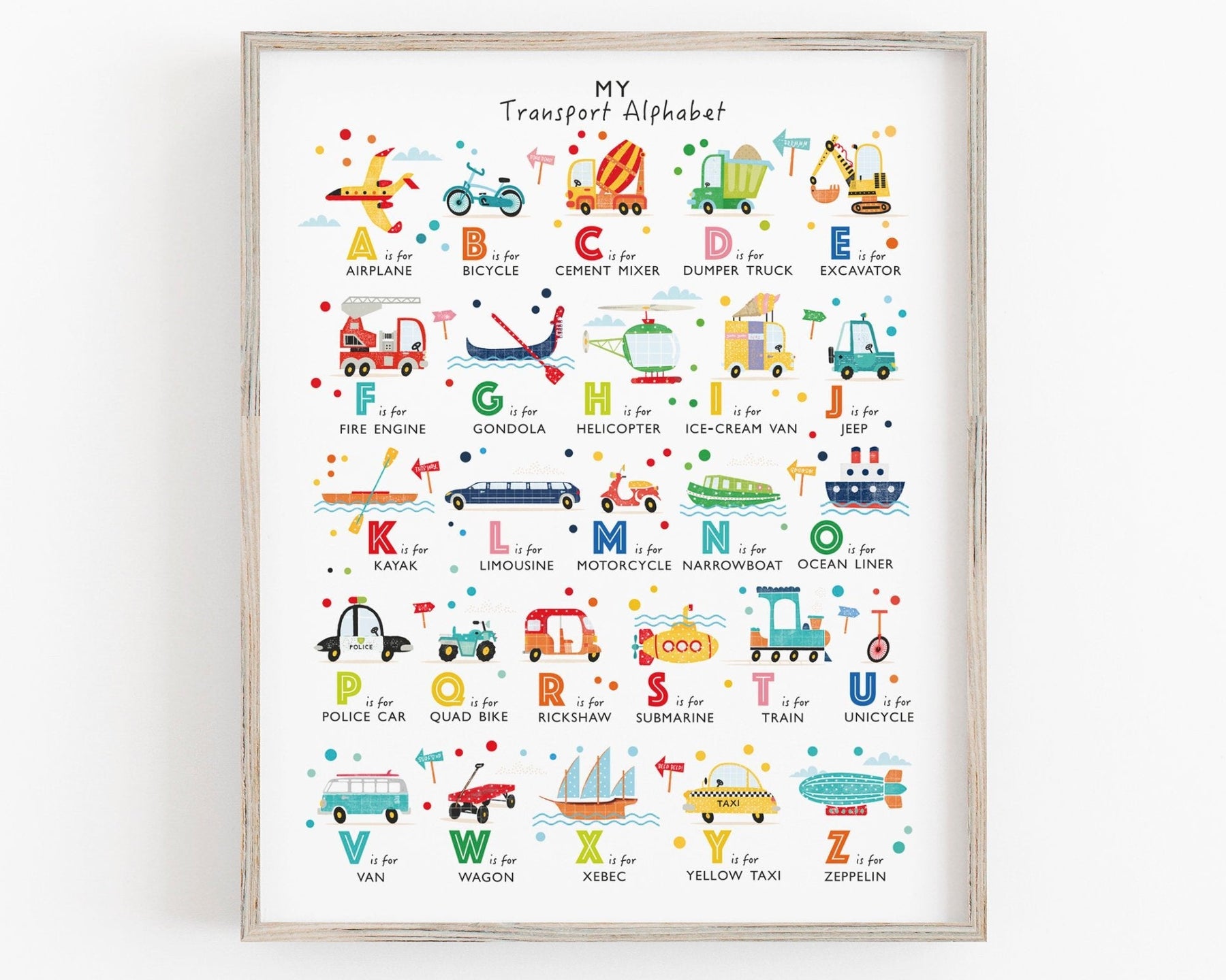 Let your little transport lover explore the vehicle world with this vibrant and colourful alphabet print! This print features 26 individual cute and stylish illustrations to help them learn the ABCs in a fun and unique way. It's perfect for boys who want to take a ride into learning! A perfect pop of colour for a little boy's room!🚆🚁🚗🚢🚲🚟