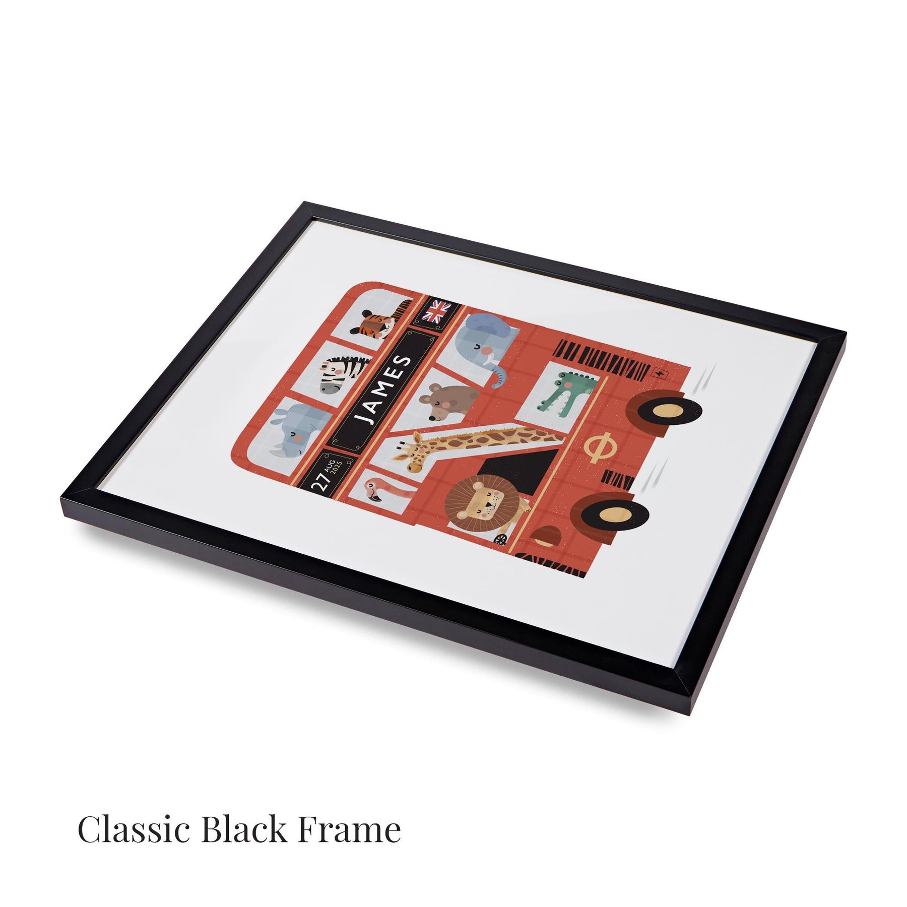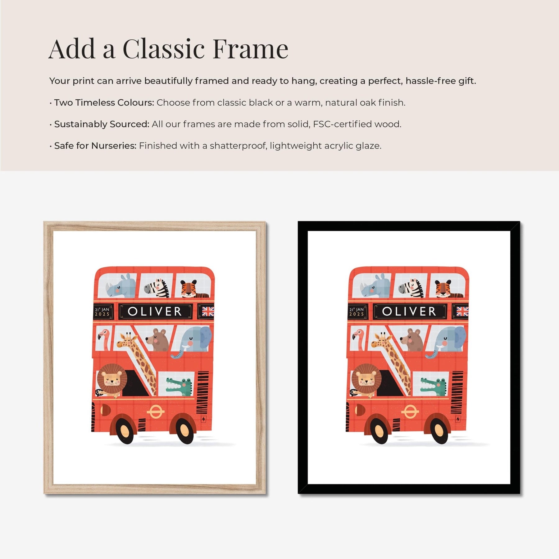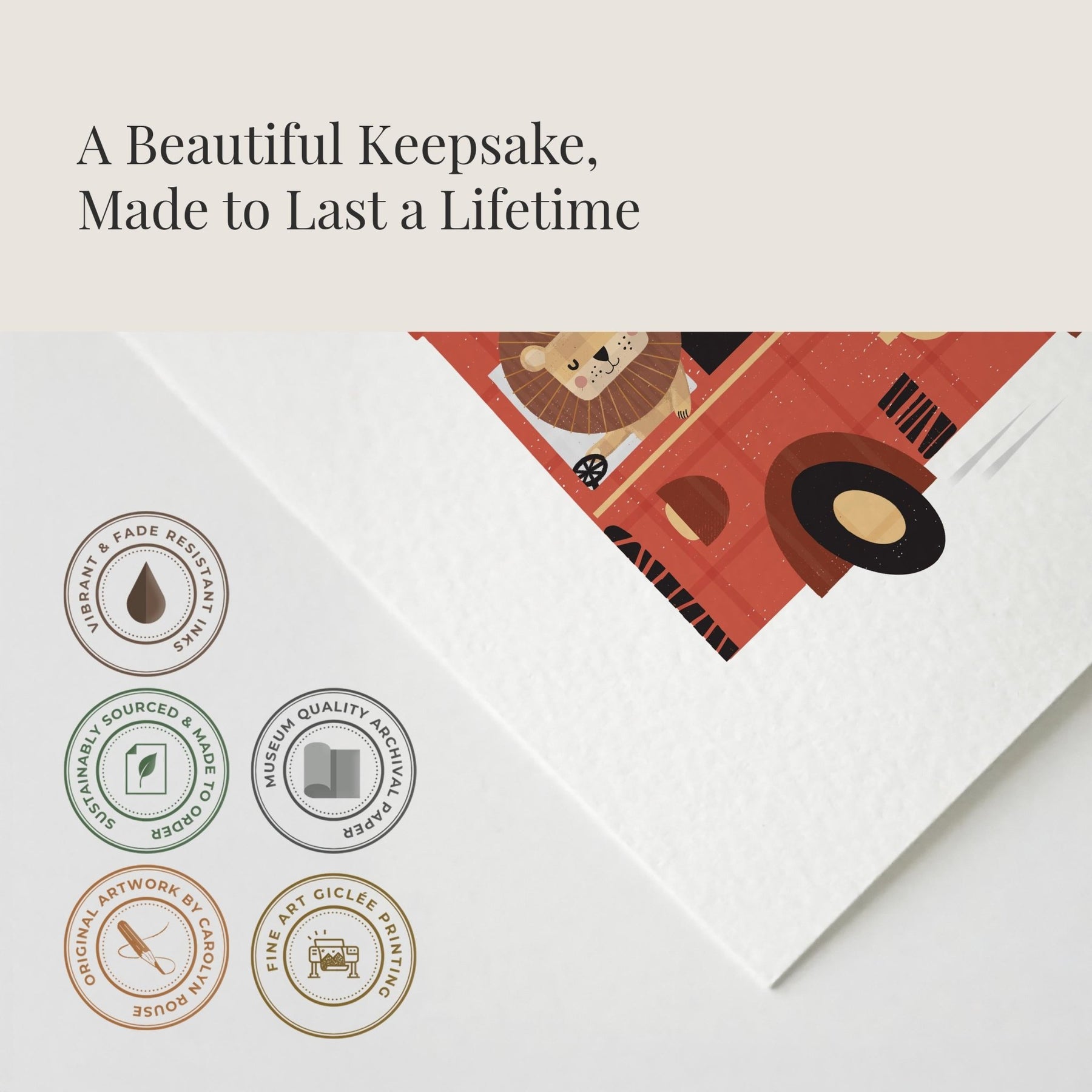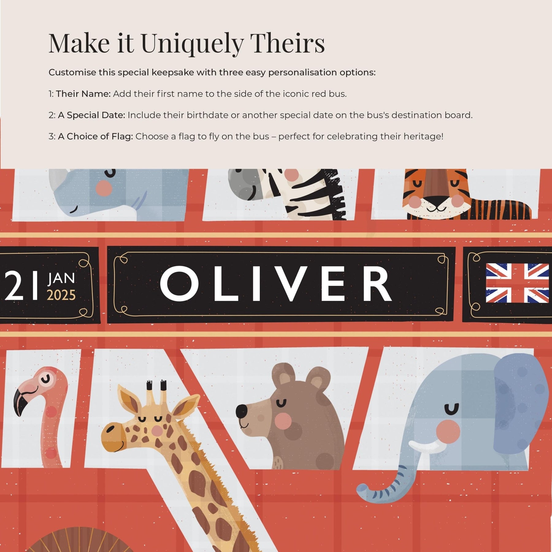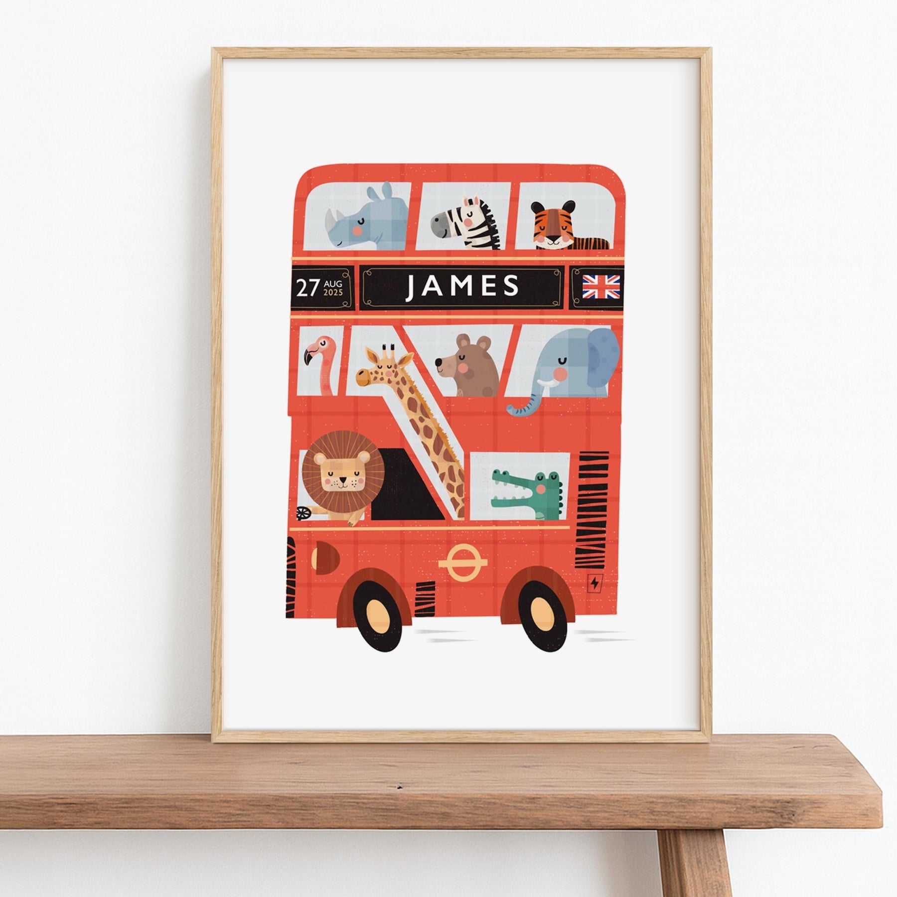 This personalised London bus print is a delightful addition to any child's space, designed to brighten kids room wall art, nursery room decor, or playroom wall print with a fun and colourful red double decker bus. Featuring charming animal passengers and your child's name, this custom kids poster creates a unique personalised name gift that sparks imagination and joy. Printed on museum grade paper using fade-resistant inks, it ensures lasting vibrancy as a birthday keepsake art or animal nursery print.