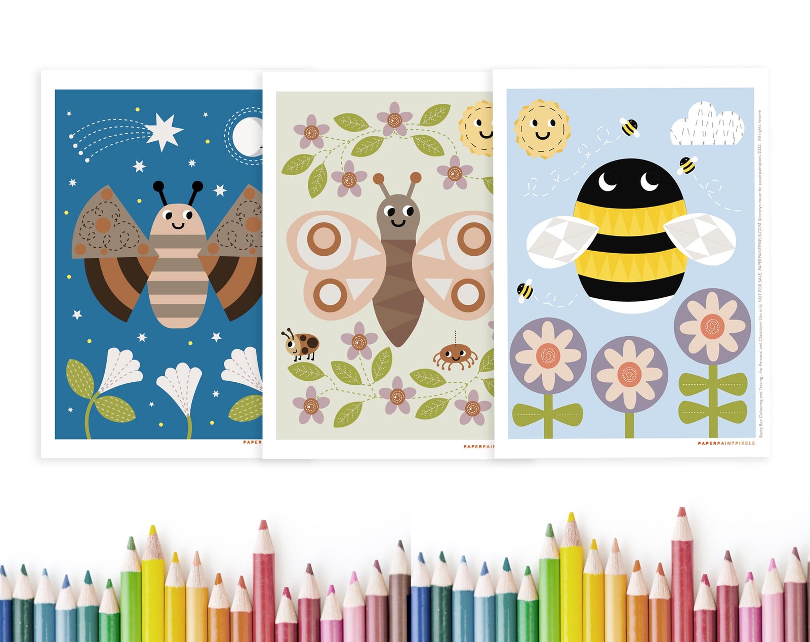 What fun! With our adorable bumble bee, underwing moth, and peacock butterfly (all taken from my lovely bees and butterflies alphabet print) these activity sheets are designed to appeal to young minds. It's a great way to keep them engaged during those rainy summer days! 🌧️🌈 Colour the pictures and trace along the dotted lines. The original illustrations are available to download as well to make choosing colours easy and help with colour recognition.