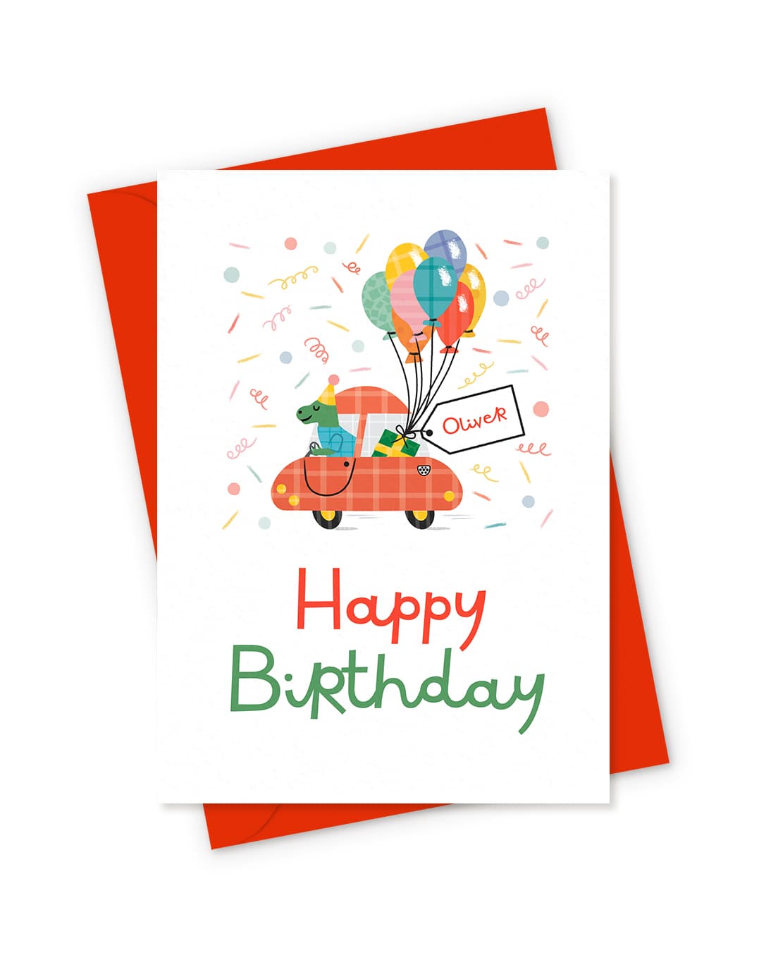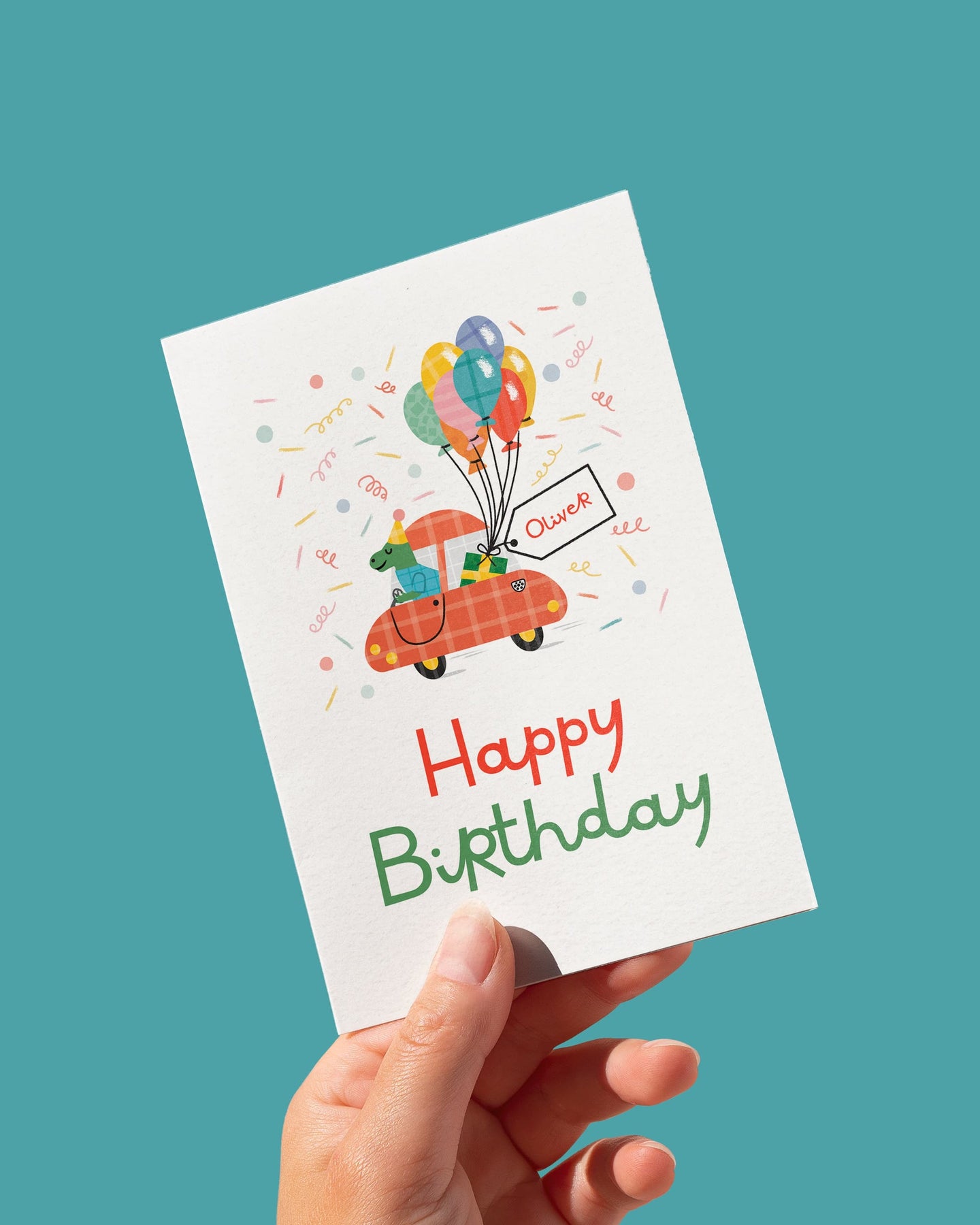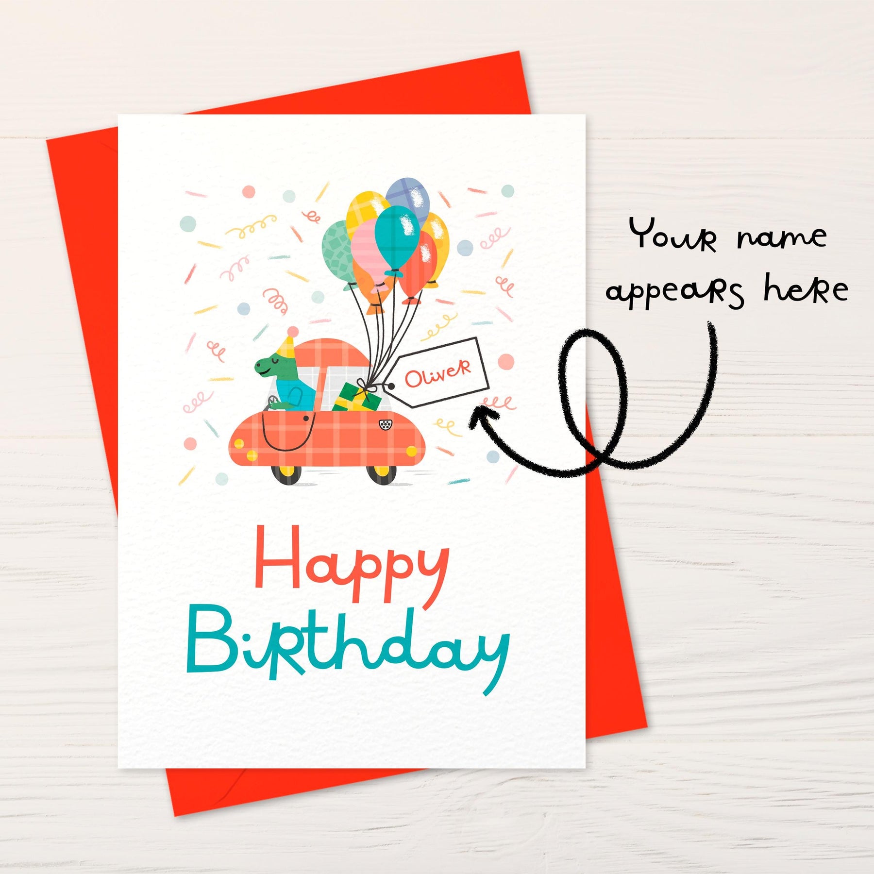 This charming card is perfect for any little one who loves dinosaurs, cars, or just a good giggle. For a truly personal touch, you can choose to add their name to the little gift tag on the presents. Or, you can select the standard version for a classic greeting. Either way, it's a cheerful way to say 'Happy Birthday' that is sure to stand out on any mantelpiece.