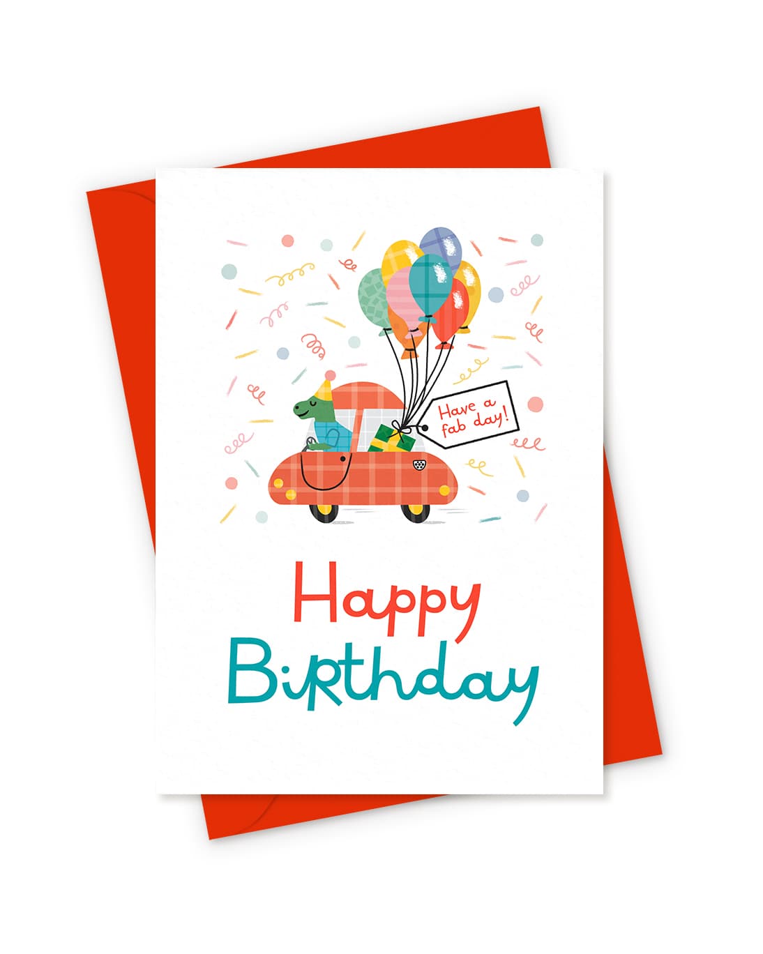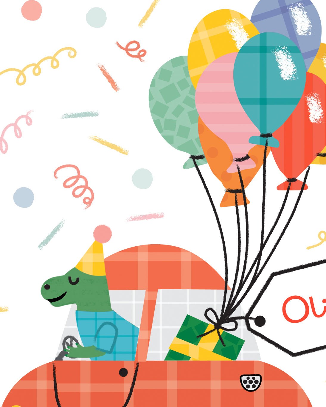 What could be more fun than a dinosaur driving a car to a party? I created this card to capture that joyful, silly sense of fun that makes a birthday so special. It features one of my happiest dinosaurs, out for a drive to deliver the biggest birthday wishes.